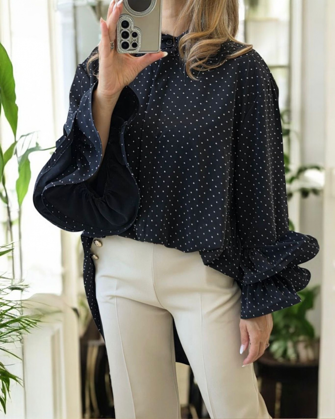 Bluza eleganta cu pietricele, maneci cu volane si croi foarte larg. Realizata din vascoza 75%, ideala pentru tinute casual sau office.