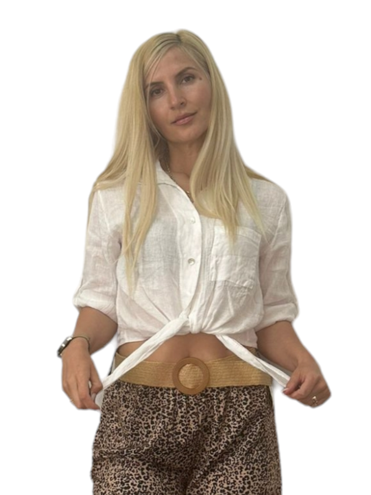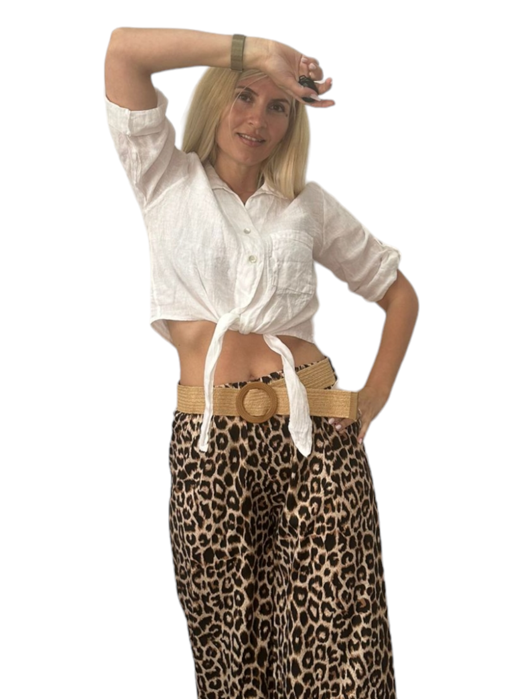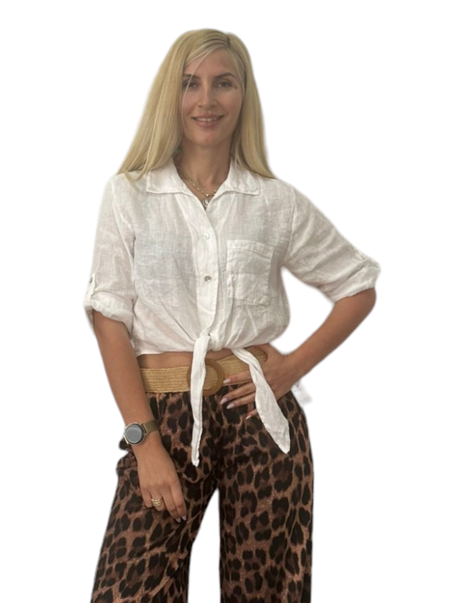 Camasa din in ce se prinde cu un nod in fata este lejera si comoda ce poate fi asortata usor in tinute casual.