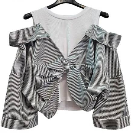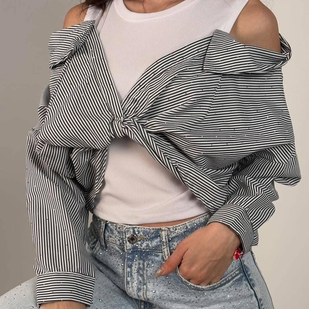 ✔️ Design 2 in 1 – maiou alb simplu cusut impreuna cu o camasa cu dungi in contrast, pentru un efect de stratificare fara efort.