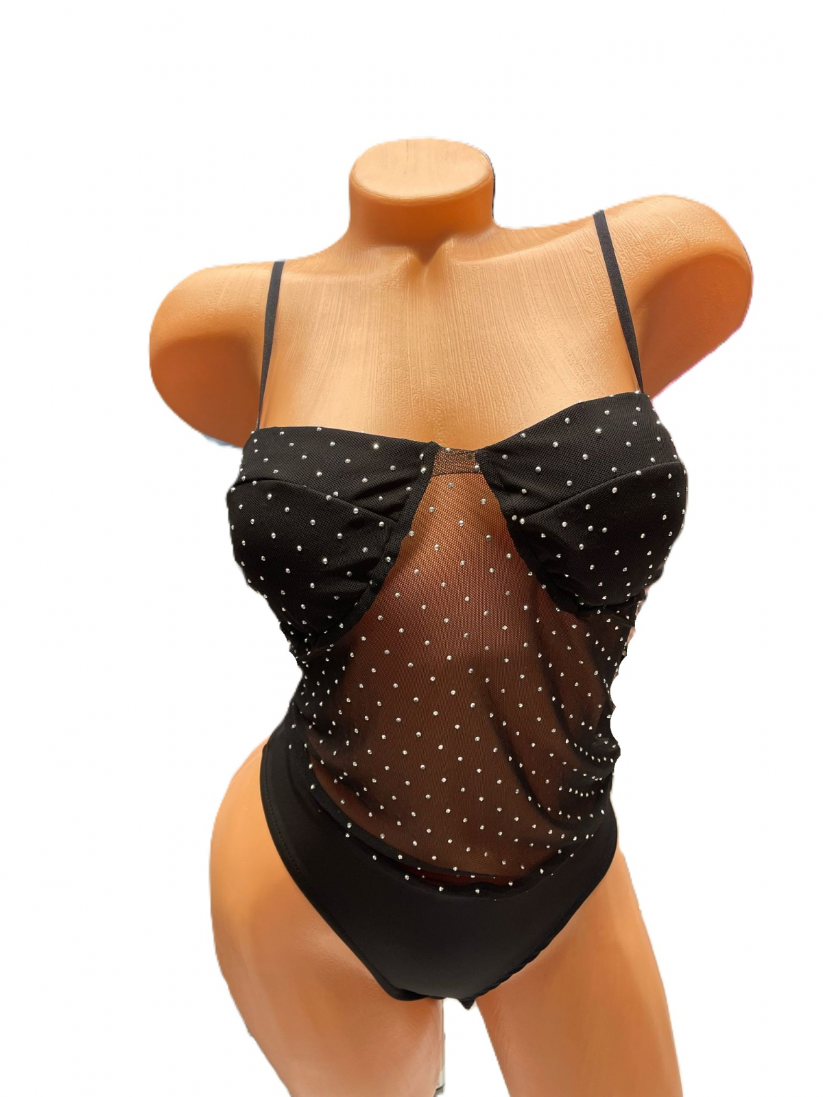 Descopera un body dama deosebit, negru, sexy si semitransparent, decorat cu strasuri fine pentru un efect stralucitor si rafinat. Fabricat din poliester elastic si confortabil, acest model se muleaza perfect pe formele tale, oferindu-ti libertate de miscare si un look provocator.