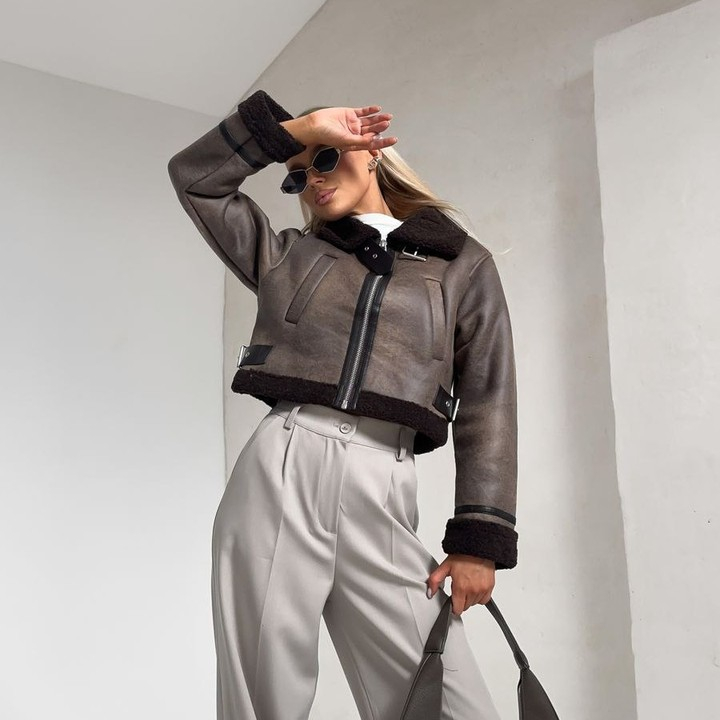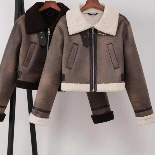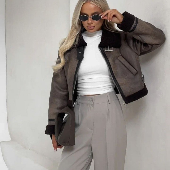 Un cojoc dintr-o combinație de piele întoarsă și blană ecologica plăcută la atingere, care servește și drept căptușeală. Modelul are diverse accesorii și cusături decorative. Masuri: S, M, L