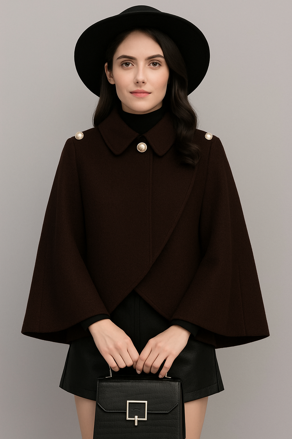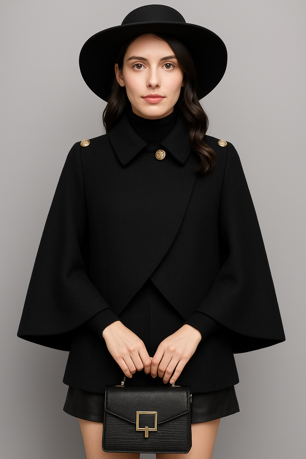 Adaugă un plus de rafinament garderobei tale cu capa eleganta pentru dama, realizata din material de calitate, cu croi lejer și design versatil. Modelul se remarcă prin nasturii decorativi aurii/perlați aplicați pe umeri și în zona gulerului, care îi oferă un aer sofisticat și ușor aristocratic.