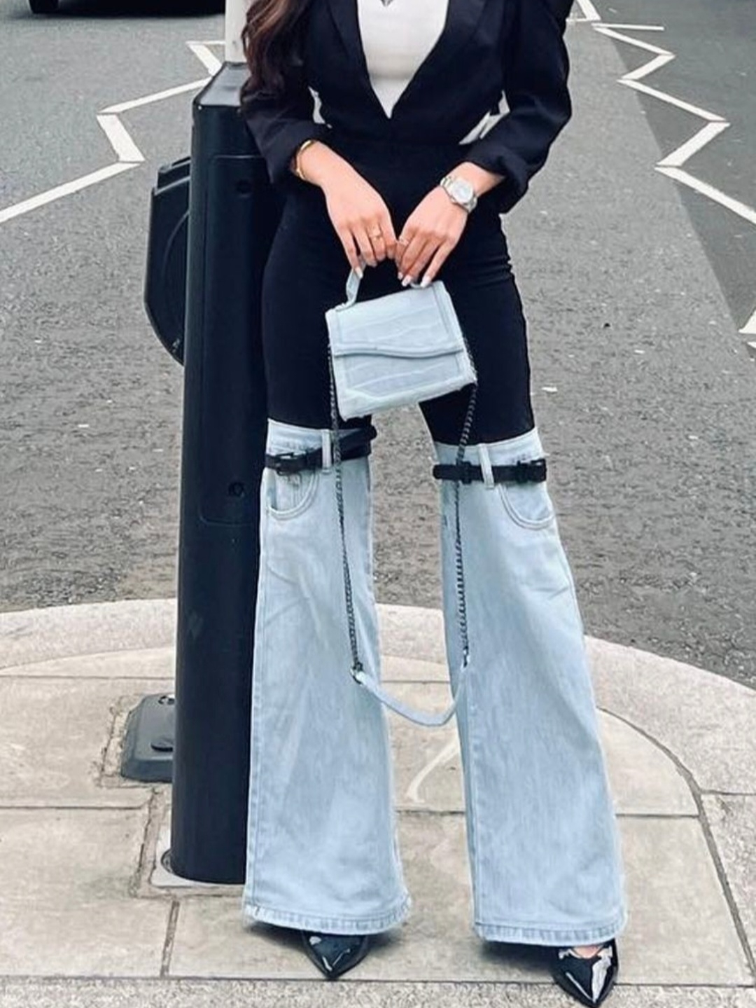 Strălucește în pantaloni spectaculoși, atrage toate privirile cu un look trendy! Tip colanți în partea de sus și detalii din denim cu curea la baza. Confort și eleganță garantate! Talie înaltă și elastică pentru o siluetă estilizată. Funcționali și versatili, ideali cu o cămașă sau top și geacă. Îngrijire ușoară pentru un look impecabil. Fii în pas cu moda!