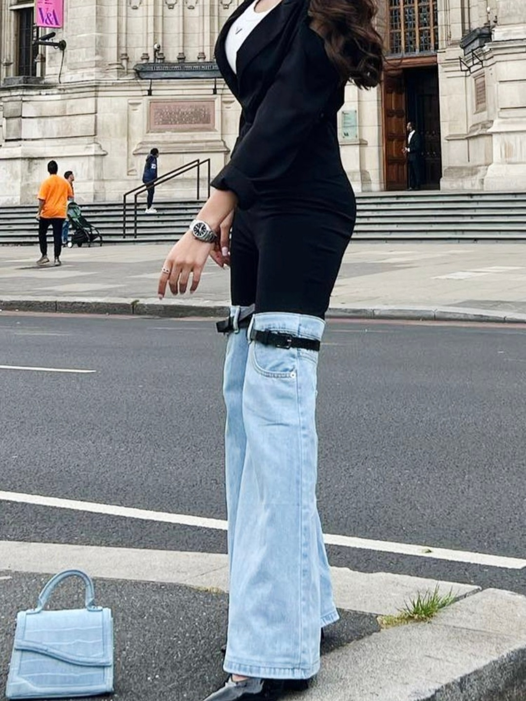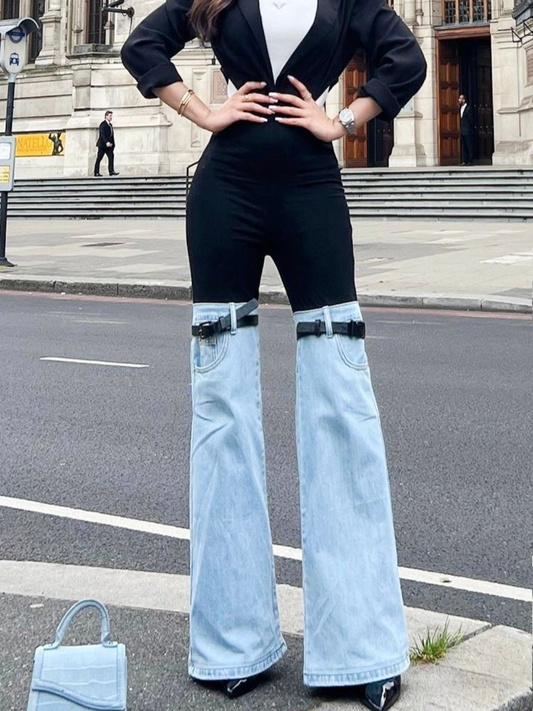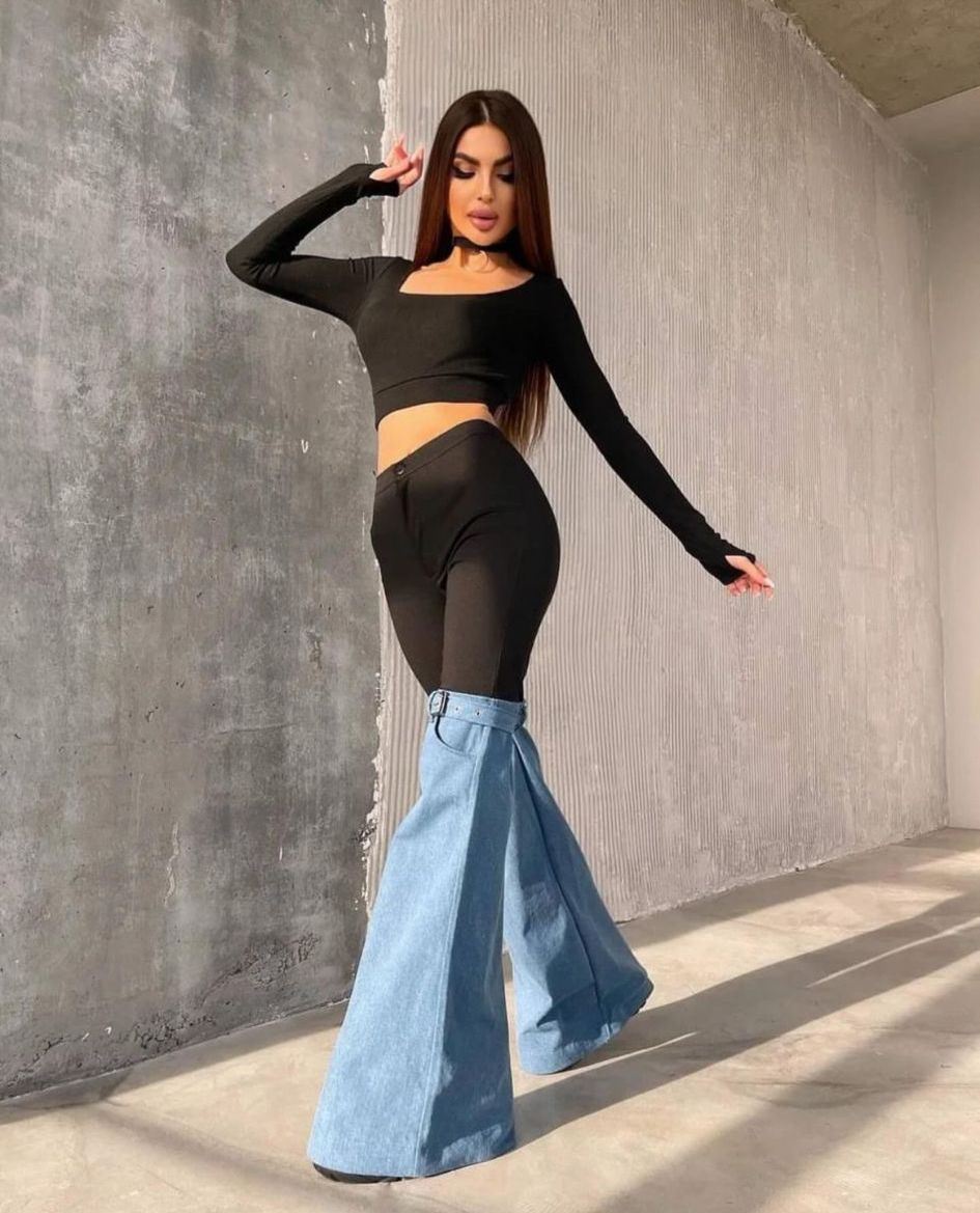 Pantaloni dama spectaculoși, ce atrag toate privirile! Tip colanți în partea de sus și detalii din denim cu curea la baza. Talie înaltă și elastică pentru o siluetă estilizată. Funcționali și versatili, ideali cu o cămașă sau top și geacă.