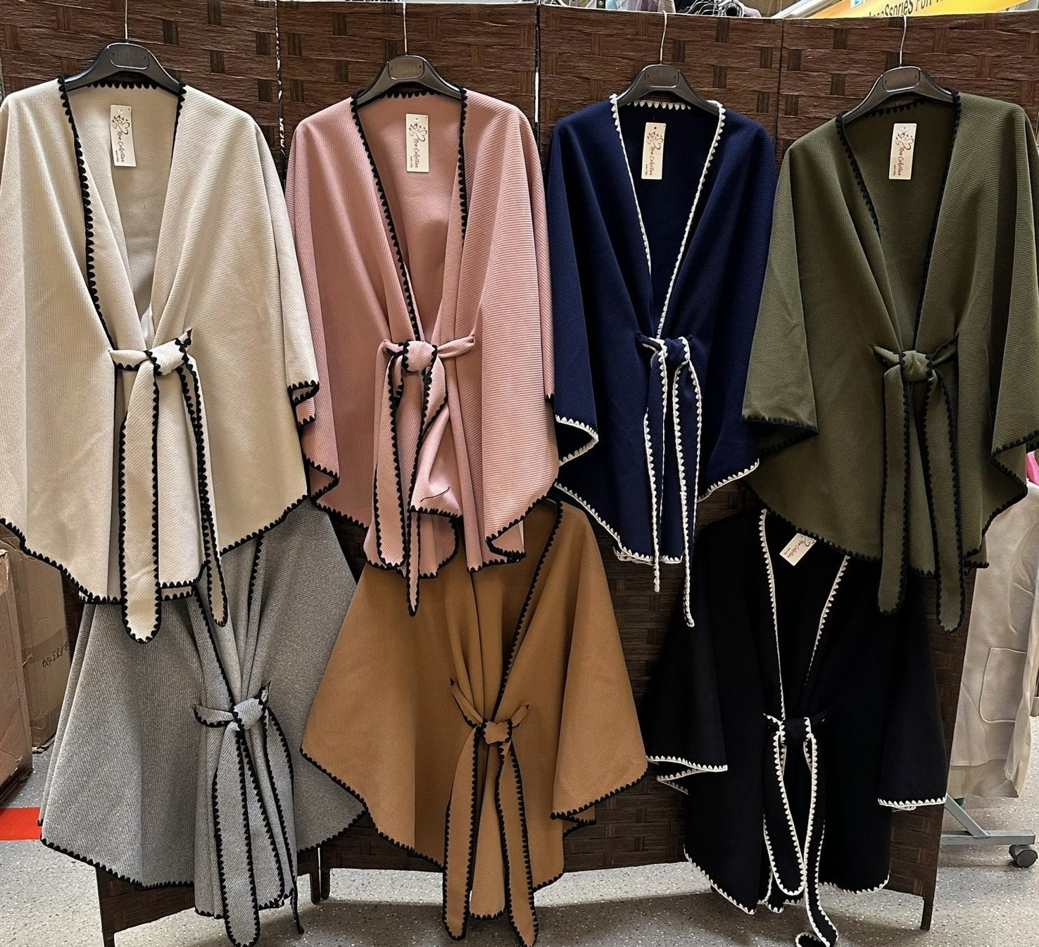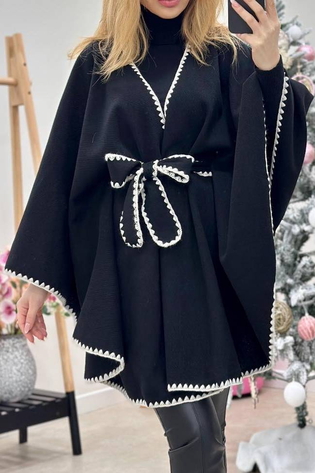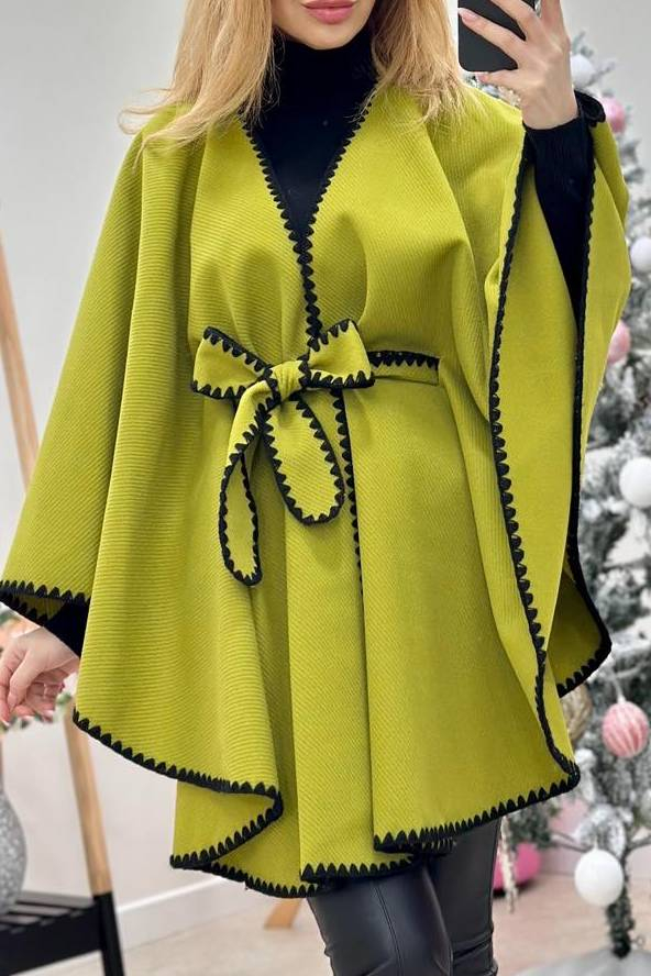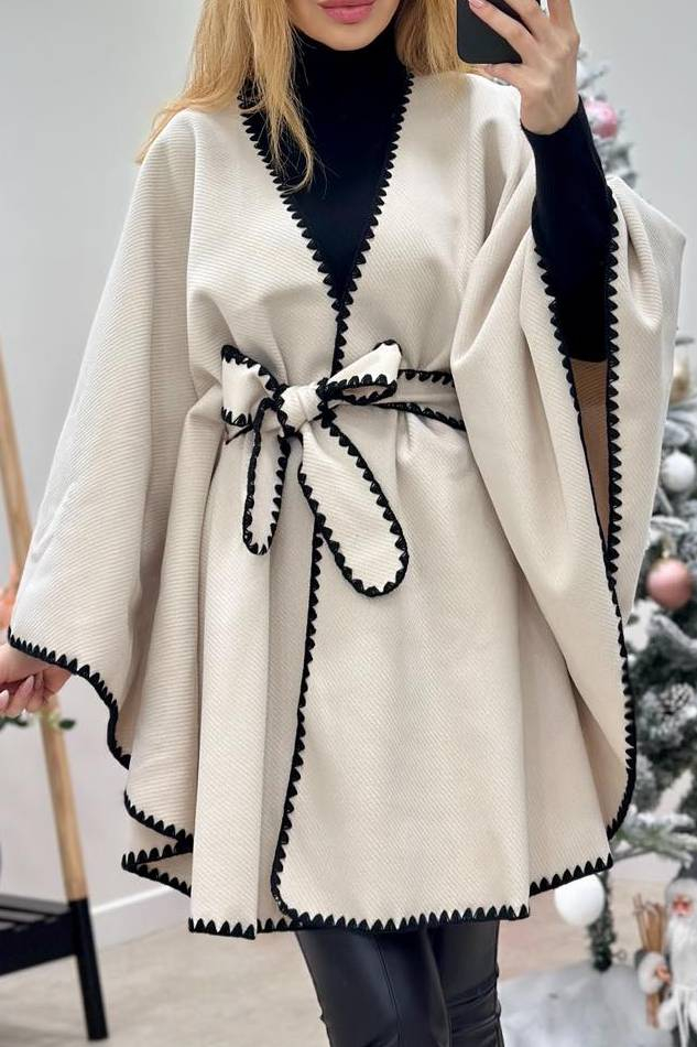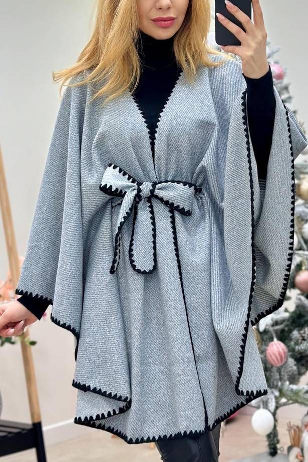 Poncho-ul stil Capa este piesa vestimentara perfecta pentru zilele in care doresti sa imbini eleganta cu confortul. Realizat din stofa de calitate, acest model cu cordon in talie iti evidentiaza silueta si iti ofera libertate de miscare datorita croiului lejer.