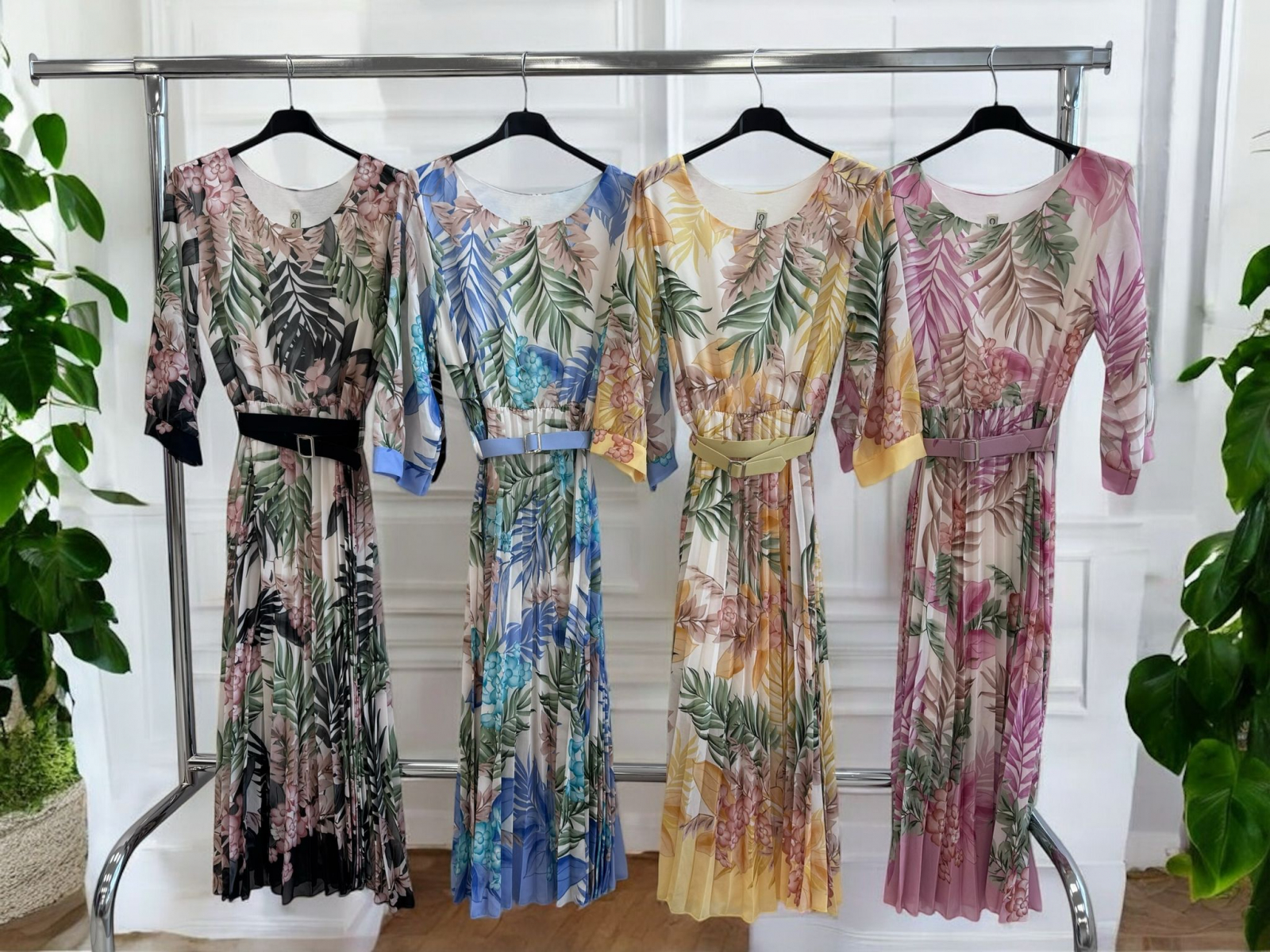 Adauga un plus de eleganta garderobei tale estivale cu aceasta rochie lunga din triplu voal, usor plisata si decorata cu imprimeuri florale bogate. Rochia are croiala lejera, maneca 3/4 si este accesorizata cu o curea subtire in talie, perfecta pentru un look feminin si armonios.