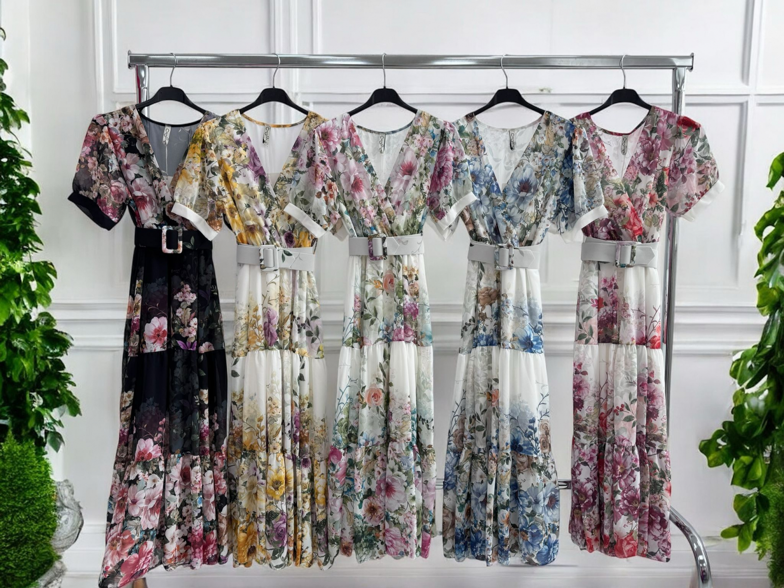Adauga feminitate si rafinament garderobei tale cu aceasta rochie lunga vaporoasa, realizata din material usor si placut la atingere, ideala pentru zilele calde. Rochia are un croi in clos cu volane pe lungime, maneci scurte bufante si decolteu petrecut in stil cache-coeur. Talia este marcata elegant de o curea lata, cu catarama decorativa, oferind un plus de stil si evidentiind silueta. Imprimeul floral in multiple variante de culoare confera un aer romantic si versatil, potrivit atat pentru tinute casual chic, cat si pentru evenimente speciale.