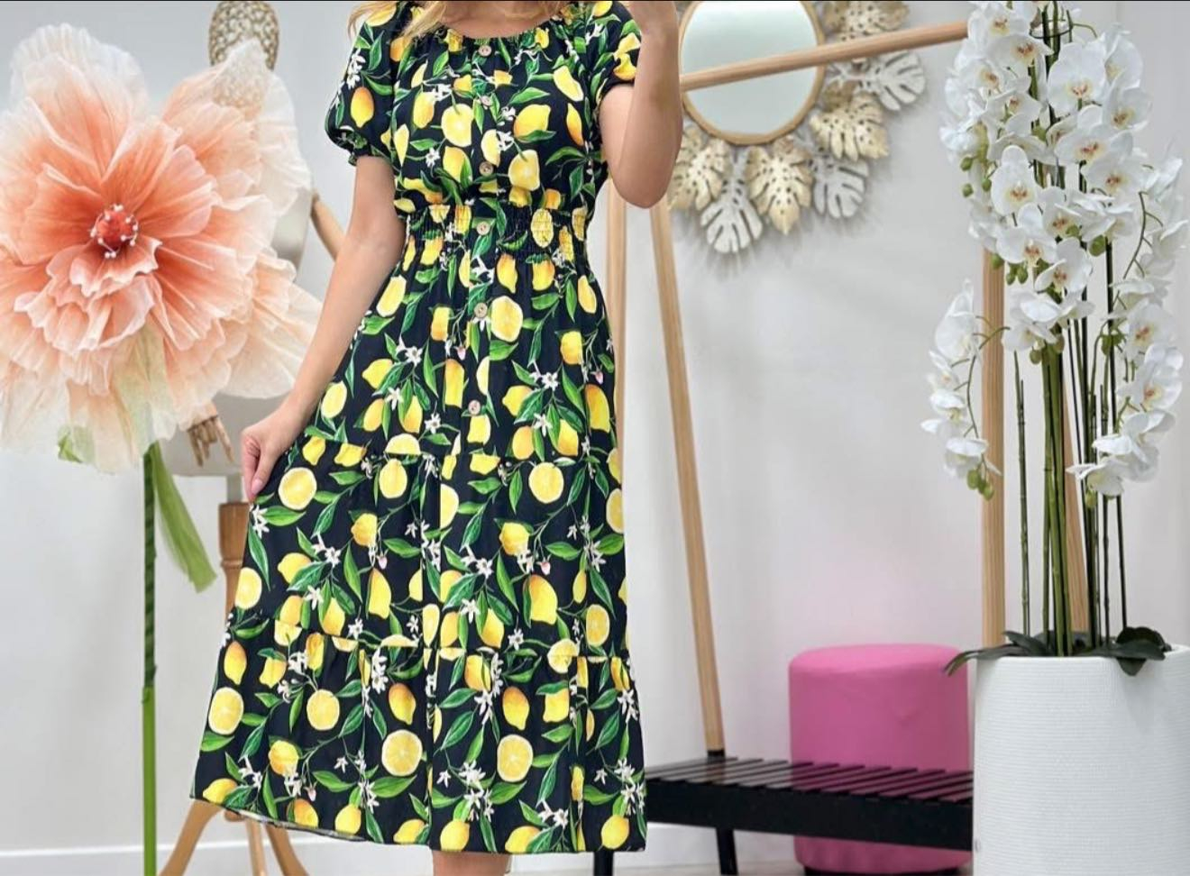 Rochie lunga din vascoza, imprimeu lamai, marime universala S-XL, talie elastica si croi lejer, perfecta pentru zilele de vara.