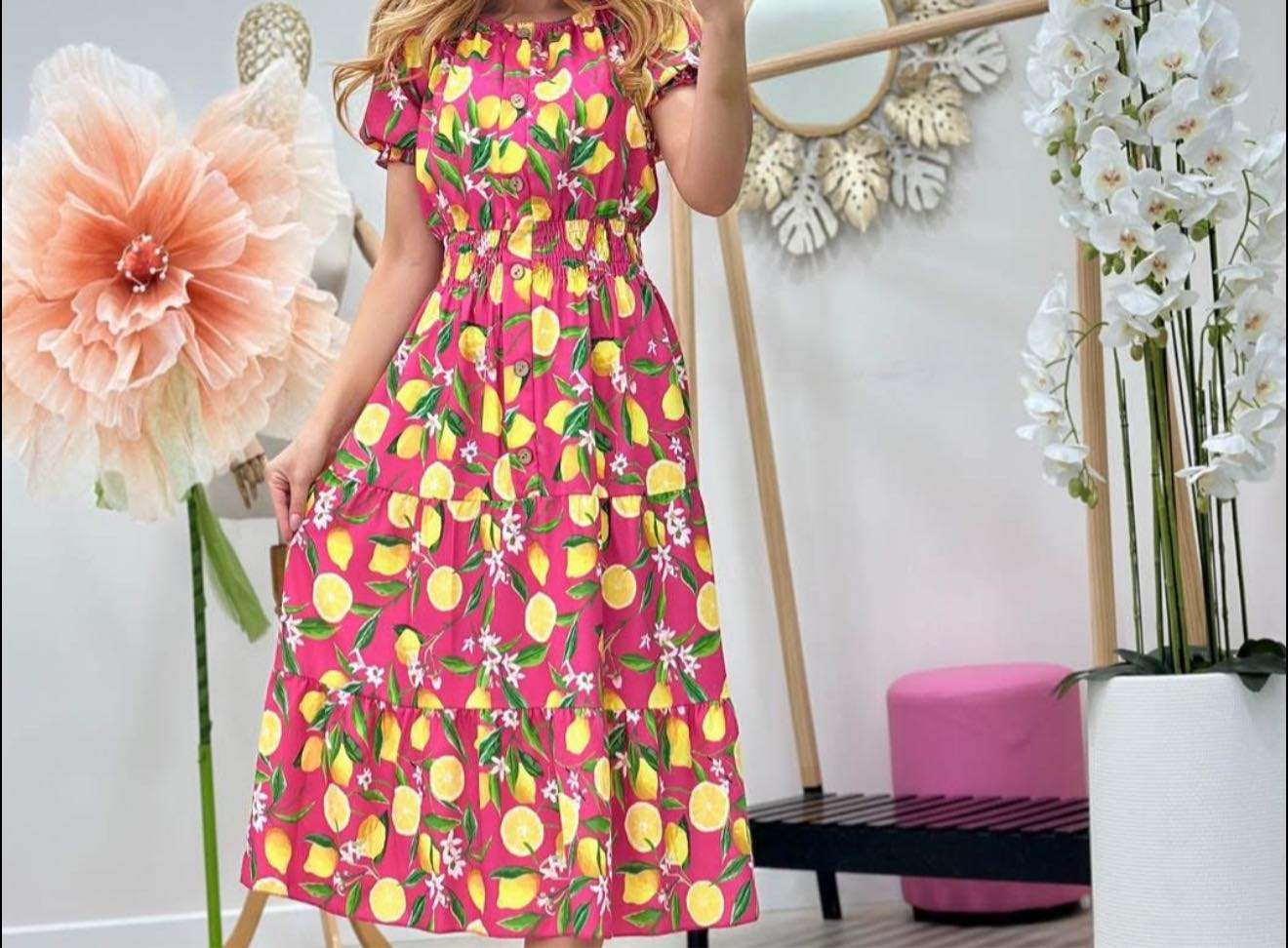 Rochia lunga din vascoza cu imprimeu lamai aduce o nota vesela si proaspata garderobei tale de vara. Este potrivita pentru marimi S, M, L si XL datorita taliei elastice (80-120 cm) si croiului lejer. Dimensiuni: bust 115 cm, talie elastica, lungime 133 cm. Materialul racoros si usor iti asigura confort pe toata durata zilei, iar imprimeul viu colorat atrage toate privirile. Poate fi purtata la plaja, in oras sau la evenimente casual.