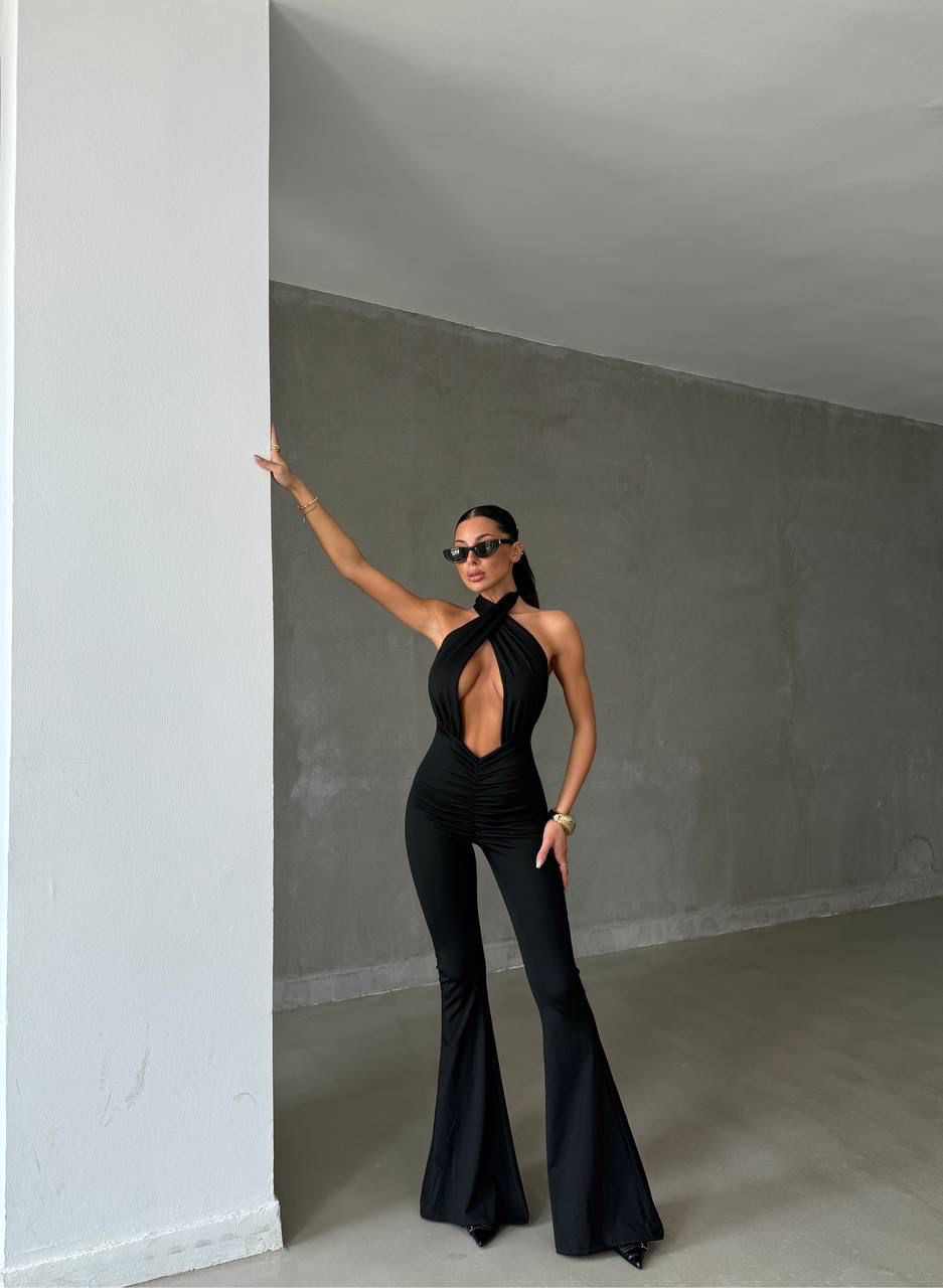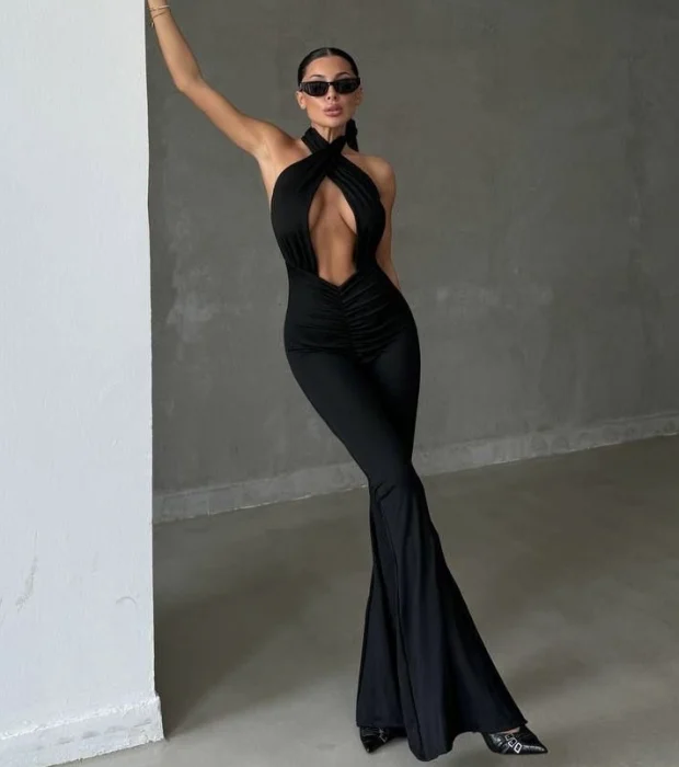 Bretelele se leaga dupa gat, oferind suport optim bustului si un look sculptat. Pantalonii au un croi evazat, ce echilibreaza perfect silueta si adauga o nota retro moderna. Este o piesa statement, disponibila in marimile S si M, potrivita pentru femei increzatoare care vor sa iasa in evidenta.