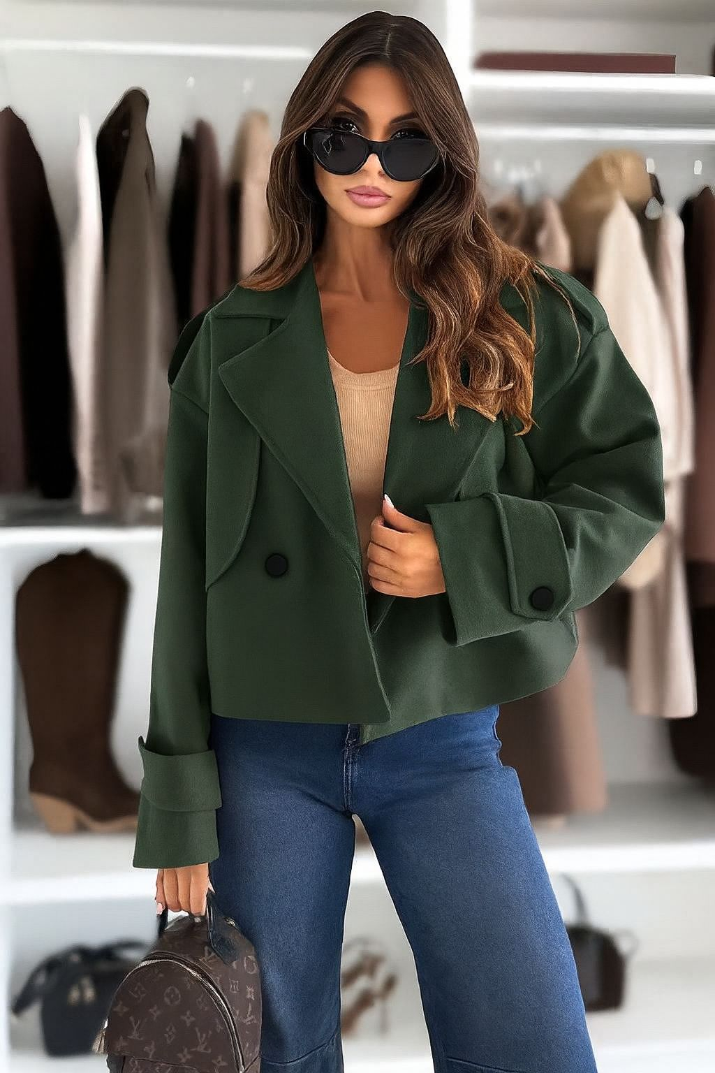 Completeaza-ti garderoba cu o jacheta scurta moderna pentru dama, realizata din material calitativ, cu revere clasice si nasturi decorativi. Croiul lejer si manecile cu manseta intoarsa ofera un aer elegant si versatil, potrivit atat pentru tinutele de zi cu zi, cat si pentru un look office sau smart casual.