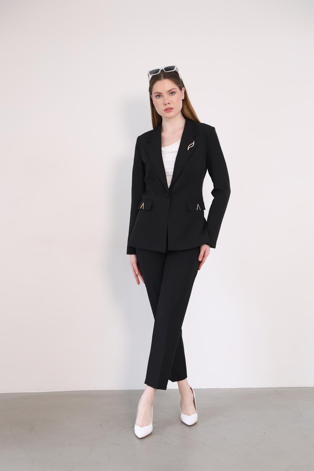 Compleul office elegant, realizat dintr-o stofa subtire si usor elastica, este piesa vestimentara ideala pentru birou, dar si pentru ocazii speciale. Acesta include un sacou cu detalii matalice aurii la buzunare si un rever accesorizat cu o brosa eleganta. Pantalonii au un croi conic, cu talie normala, iar linia cambrata a compleului ofera o silueta feminina si moderna.