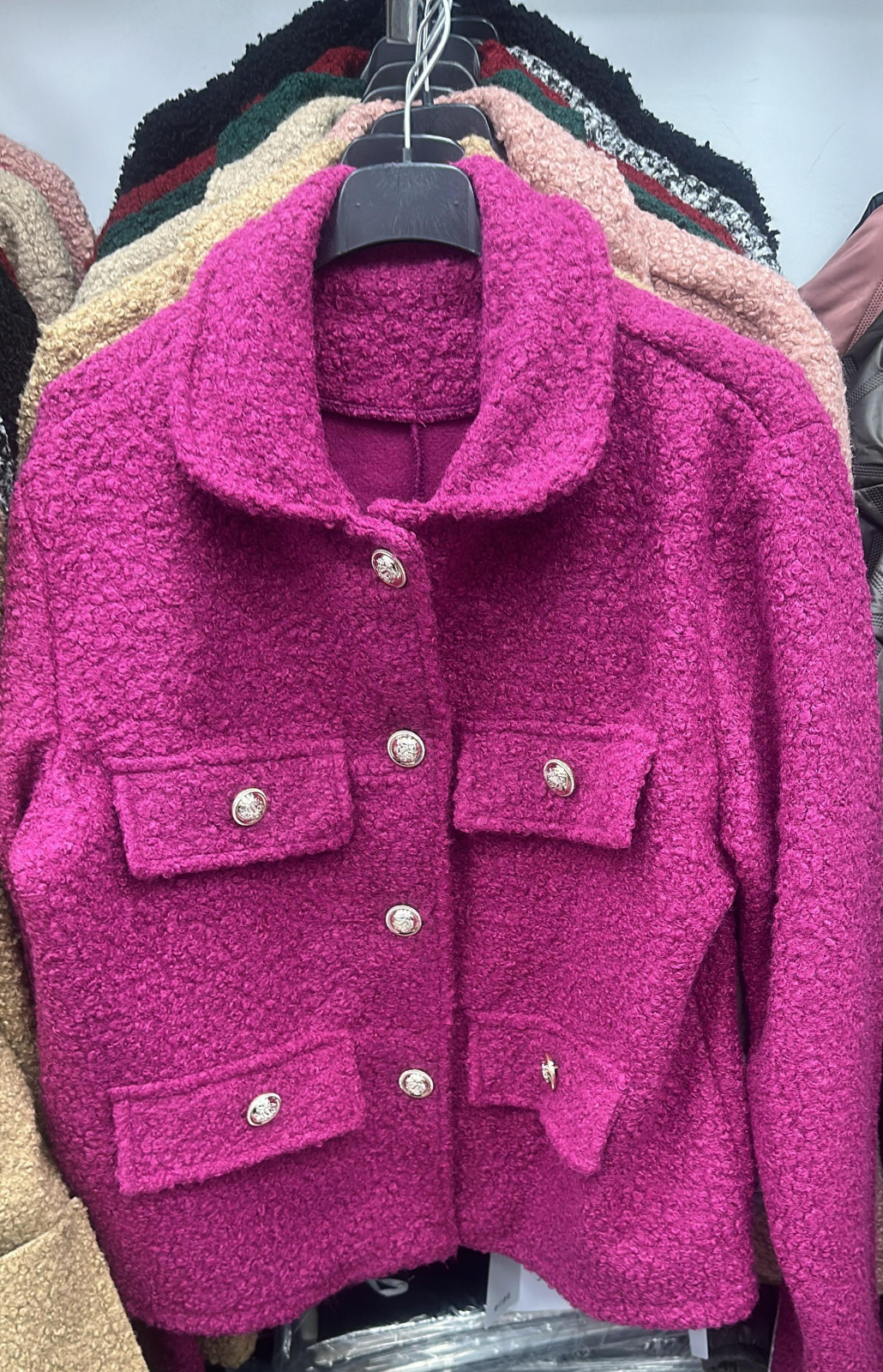 Jacheta boucle dama scurta, cu croiala dreapta si usoara tenta oversized, ideala pentru sezonul rece. Realizata din material tip boucle, calduros si placut la atingere, are patru buzunare aplicate cu nasturi metalici decorativi si se inchide cu nasturi frontali.