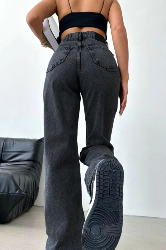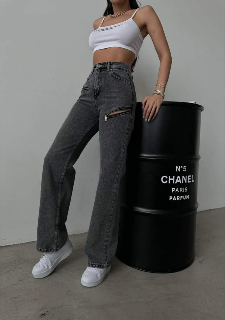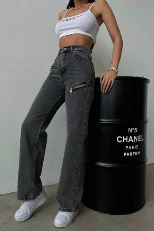 Pantaloni lungi denim - Blugi Croi Wide Leg si Decupaje cu Fermoar