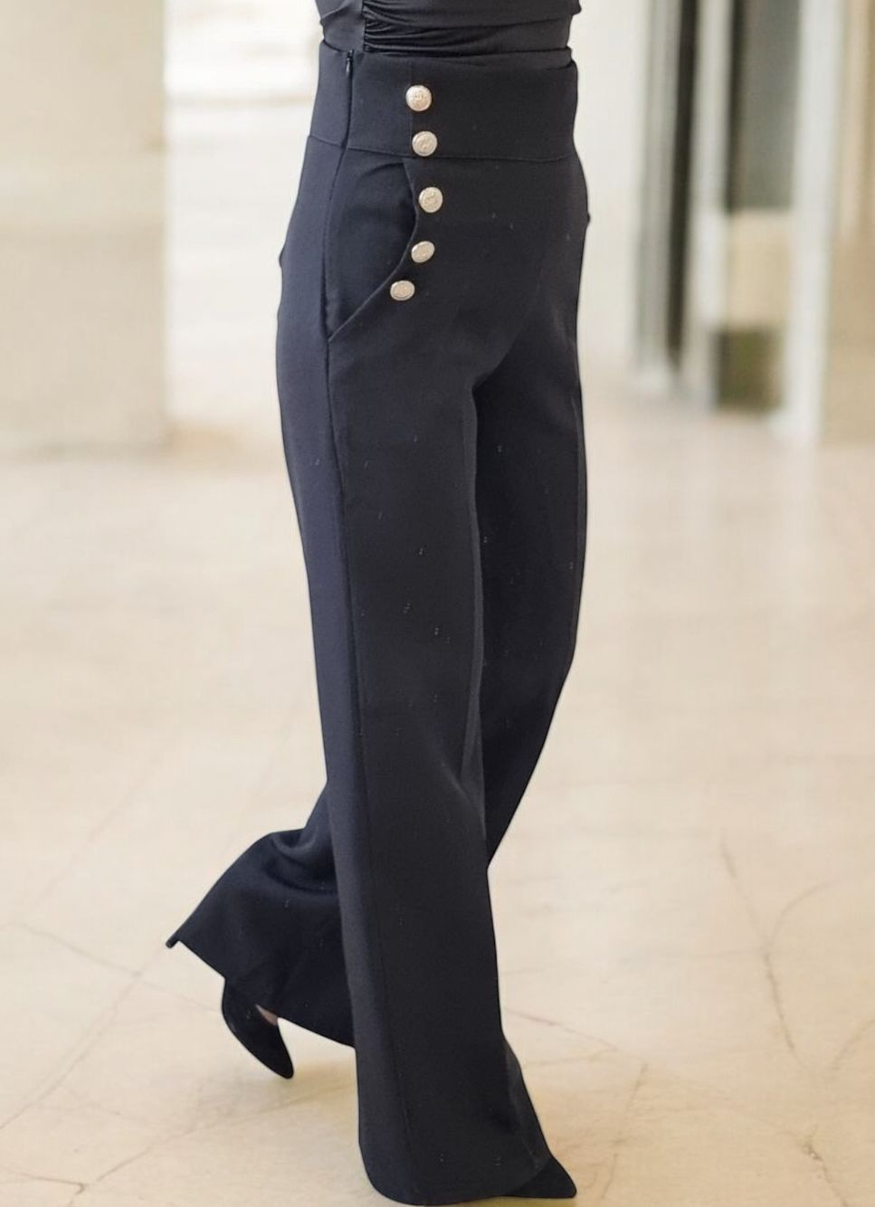 Realizați din material de calitate, acești pantaloni sunt comozi și versatili, putând fi purtați atât cu sacouri elegante, cât și cu bluze sau topuri lejere. Nasturii decorativi aurii adaugă un detaliu sofisticat, transformându-i într-o piesă statement pentru orice outfit.