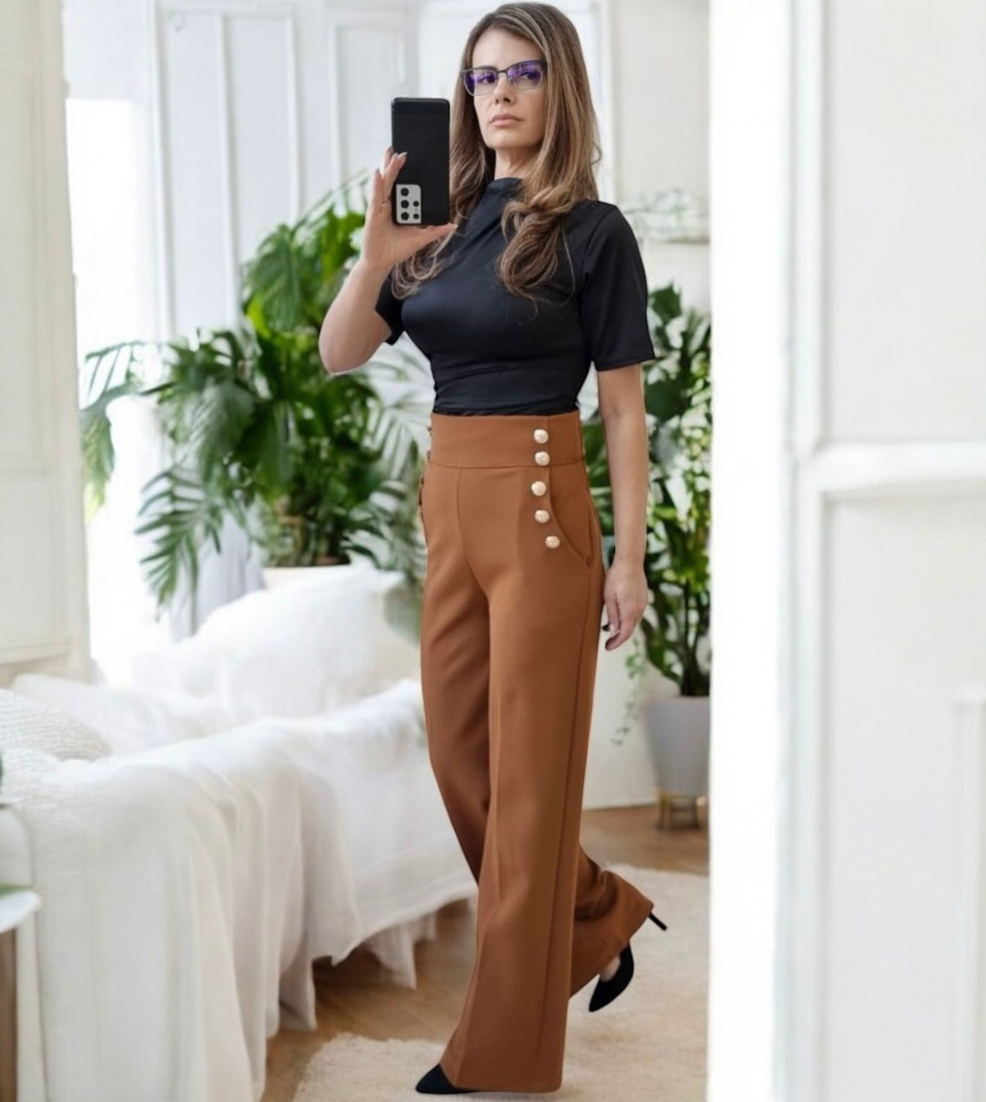 Pantalonii eleganți cu nasturi decorativi aduc un plus de stil și rafinament garderobei tale, fiind alegerea ideală pentru ținute office, casual chic sau evenimente speciale. Croiul evazat și talia înaltă avantajează silueta, alungind optic picioarele și conferind un look modern și feminin.