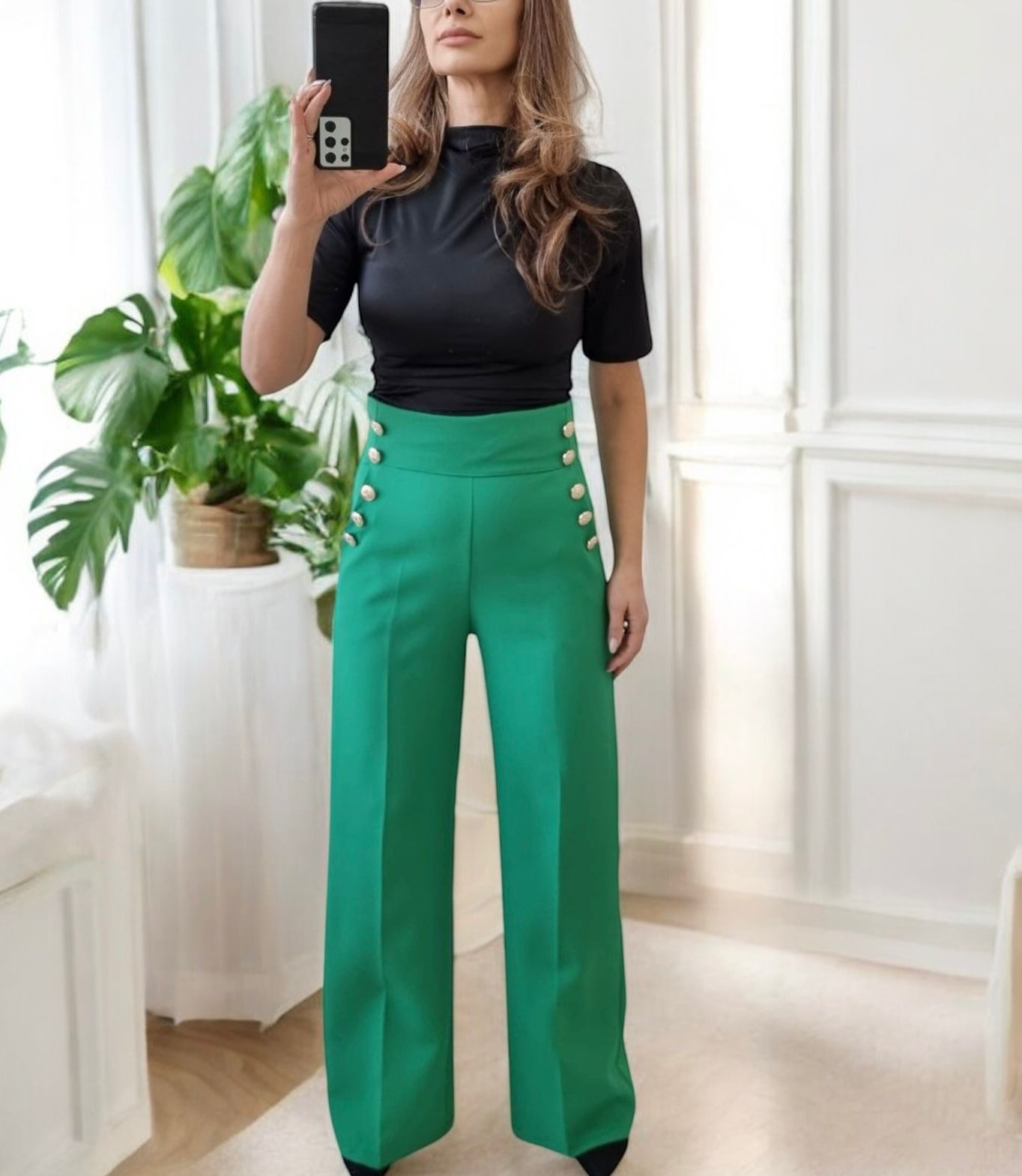 Pantaloni eleganti dama cu nasturi decorativi si croi evazat, disponibili in 7 culori. Pret redus.