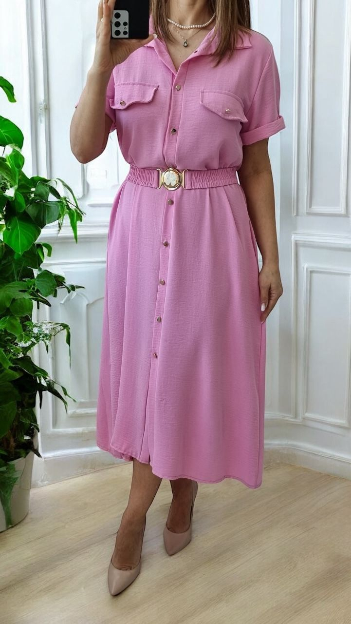 Designul cu nasturi decorativi pe toata lungimea, buzunare aplicate si maneci scurte rasfrante aduce un vibe casual-chic perfect pentru tinute de zi, birou sau plimbari urbane. Cureaua elastica accentueaza talia si adauga un plus de eleganta datorita detaliului metalic decorativ.