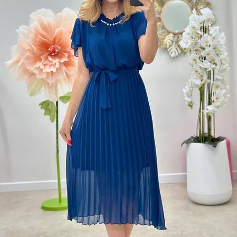 Adaugă un strop de grație și feminitate garderobei tale cu această rochie plisată din voal, ideală pentru ocazii speciale sau zile în care vrei să strălucești. Cu un design lejer și sofisticat, rochia are o croială fluidă, guler rotund decorat cu perle delicate, mâneci scurte vaporoase și un cordon detașabil care accentuează talia.