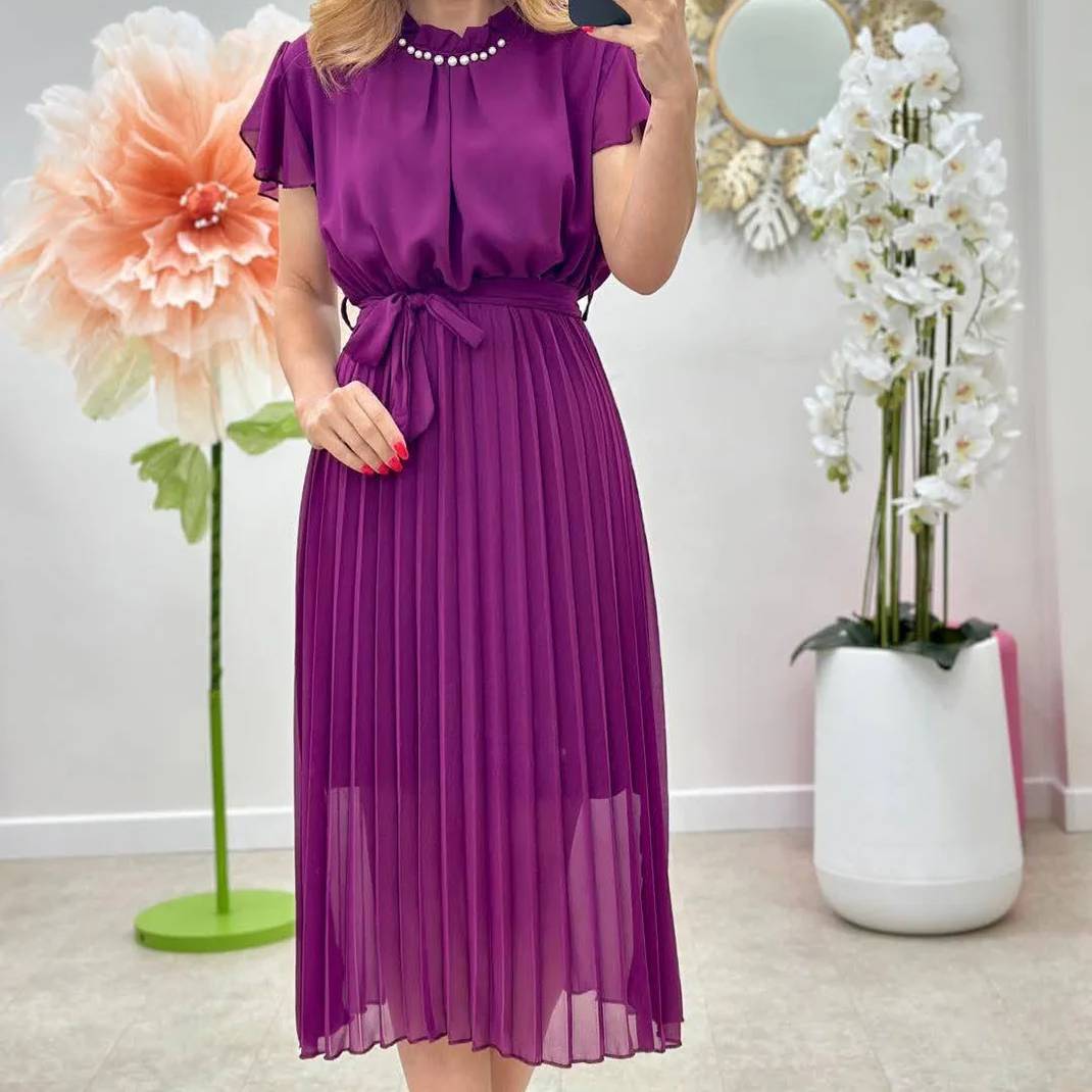 Adaugă un strop de grație și feminitate garderobei tale cu această rochie plisată din voal, ideală pentru ocazii speciale sau zile în care vrei să strălucești. Cu un design lejer și sofisticat, rochia are o croială fluidă, guler rotund decorat cu perle delicate, mâneci scurte vaporoase și un cordon detașabil care accentuează talia.