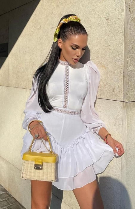 Pregătește-te să întorci capetele cu rochia aceasta cu mâneci din voal si volane sexy! ⭐️