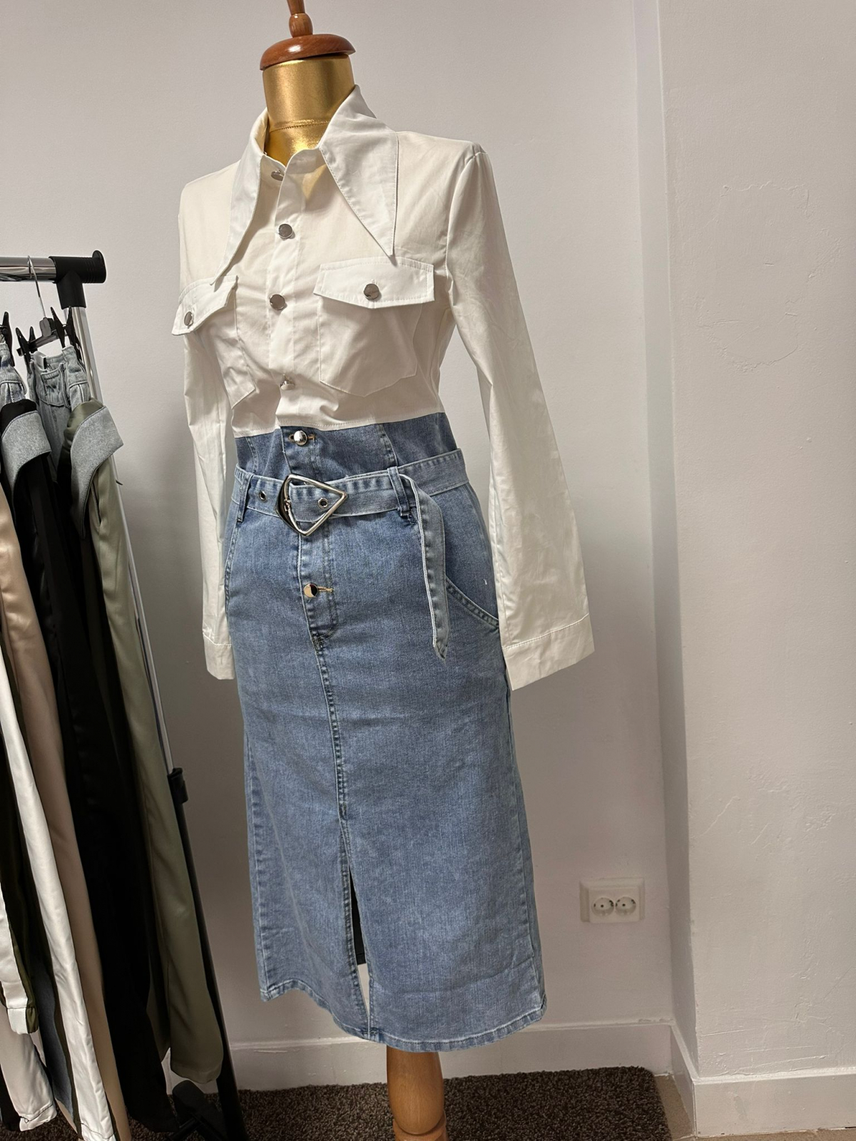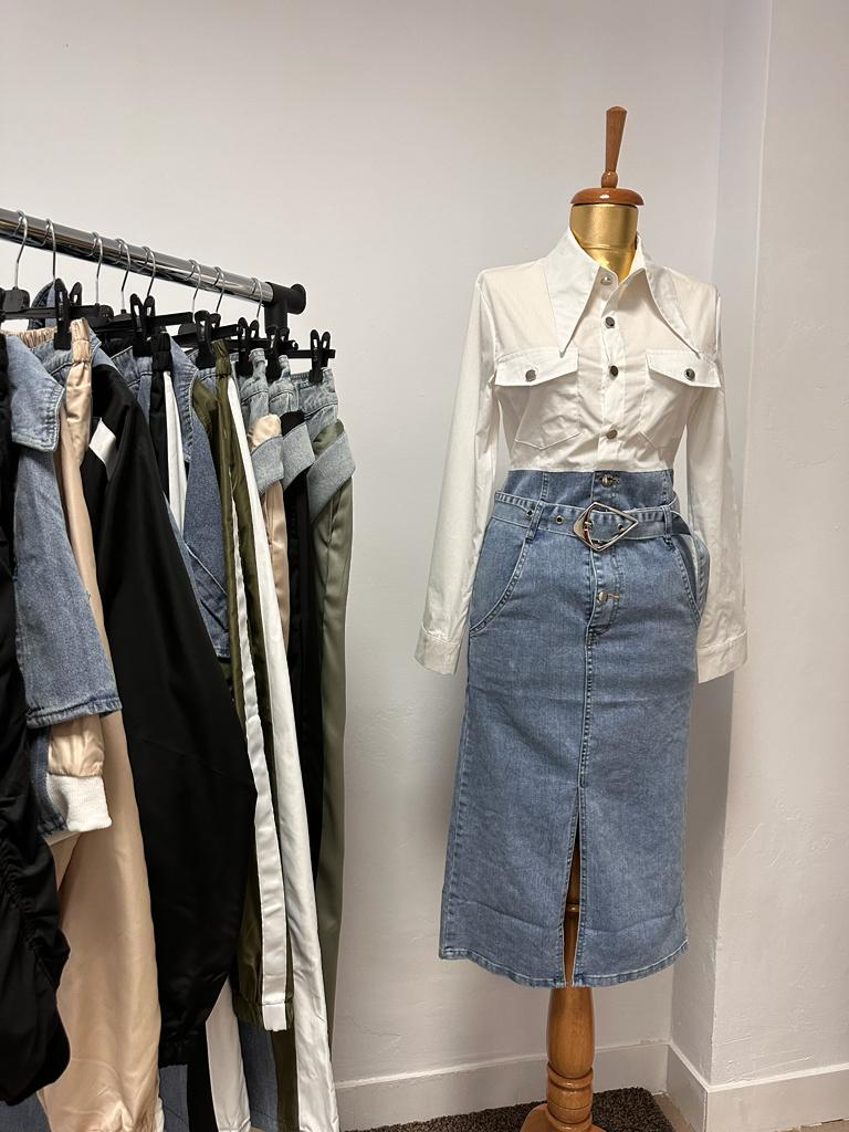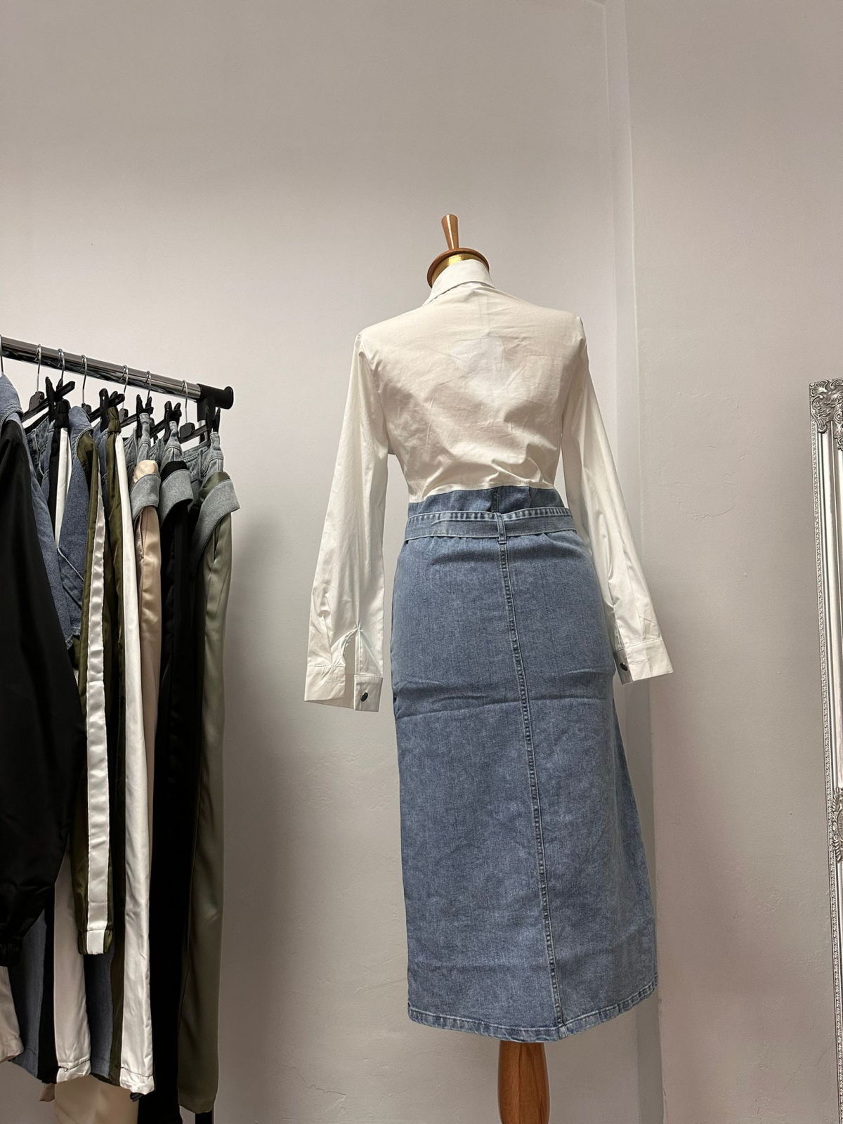Rochie Dama Denim Blend, cu guler tip camasa, inchidere cu nasturi si curea in talie.