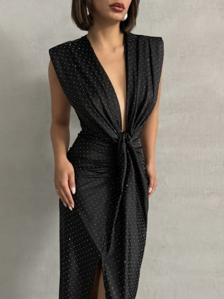 Transformă fiecare apariție într-un moment memorabil cu rochia „Hannah”, realizată din lycra elastică premium și decorată cu strasuri fine care captează lumina cu fiecare pas. Croiala sa pune în valoare silueta datorită fronseurilor laterale, decolteului adânc și despicăturii frontale ce adaugă un plus de senzualitate și rafinament.