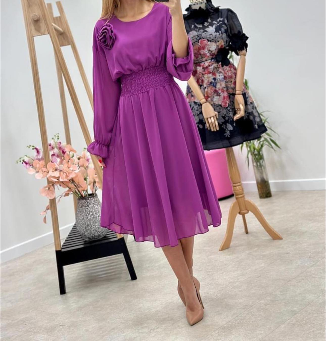 Rochie Dama Midi din Voal Captusit cu Trandafir pe Umar