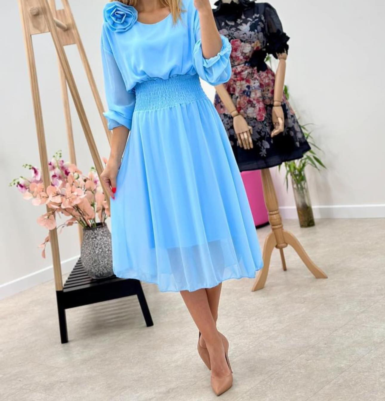 Rochie Dama Midi din Voal Captusit cu Trandafir pe Umar