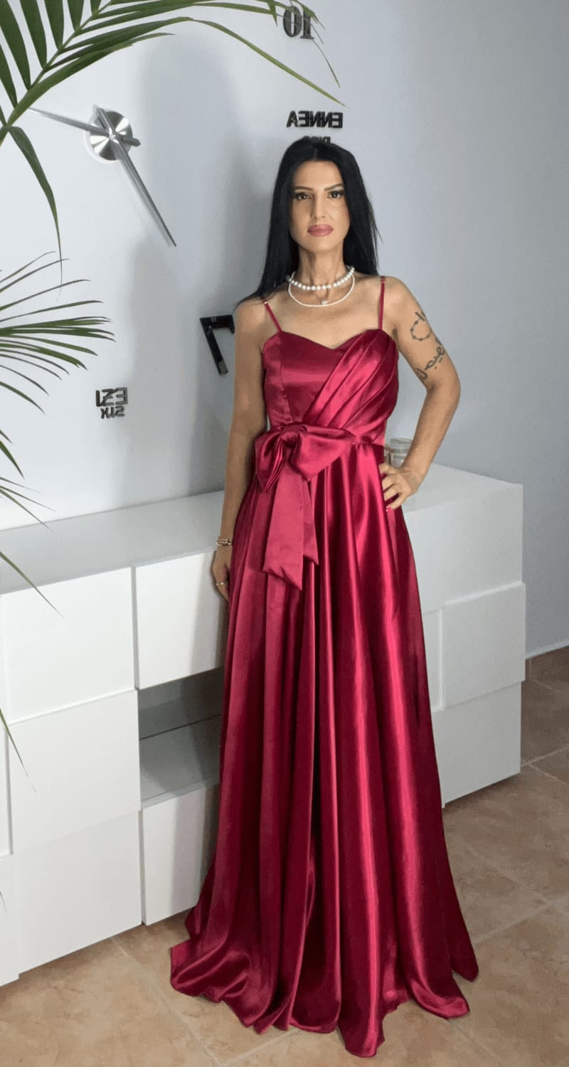 Descoperă o rochie spectaculoasă, creată din satin premium de înaltă calitate, ideală pentru ocazii elegante. Designul sofisticat include bretele ajustabile, un bust plisat cu pliuri delicate și o fundă impresionantă în talie, ce accentuează feminitatea. Cu o croială modernă, un șliț lateral atrăgător și elastic la spate pentru o potrivire perfectă, această rochie oferă confort și eleganță într-un singur look. Alege să strălucești la evenimente speciale!