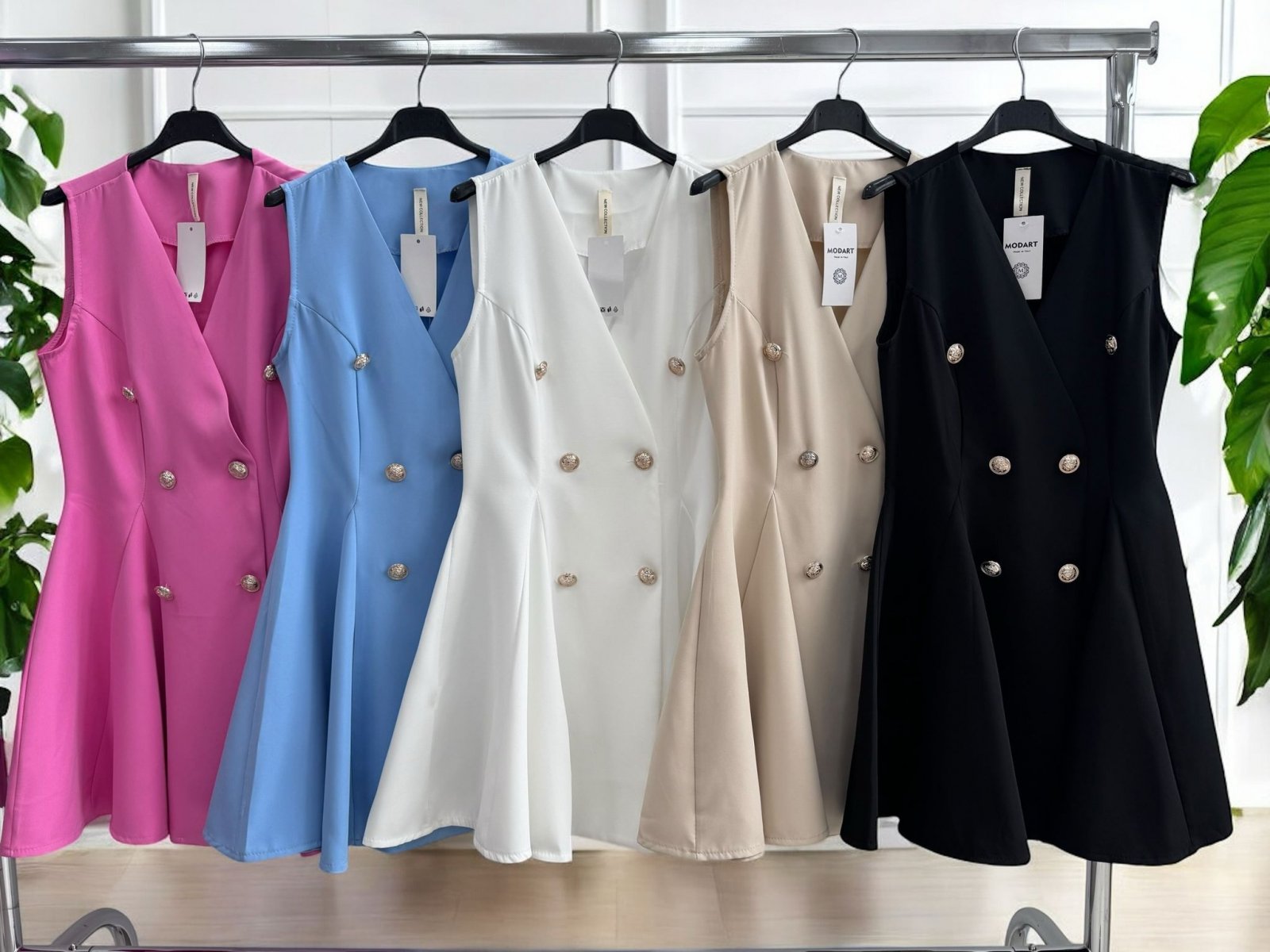 Rochie evazata eleganta, fara maneci, cu nasturi decorativi aurii, marime universala, disponibila in mai multe culori.