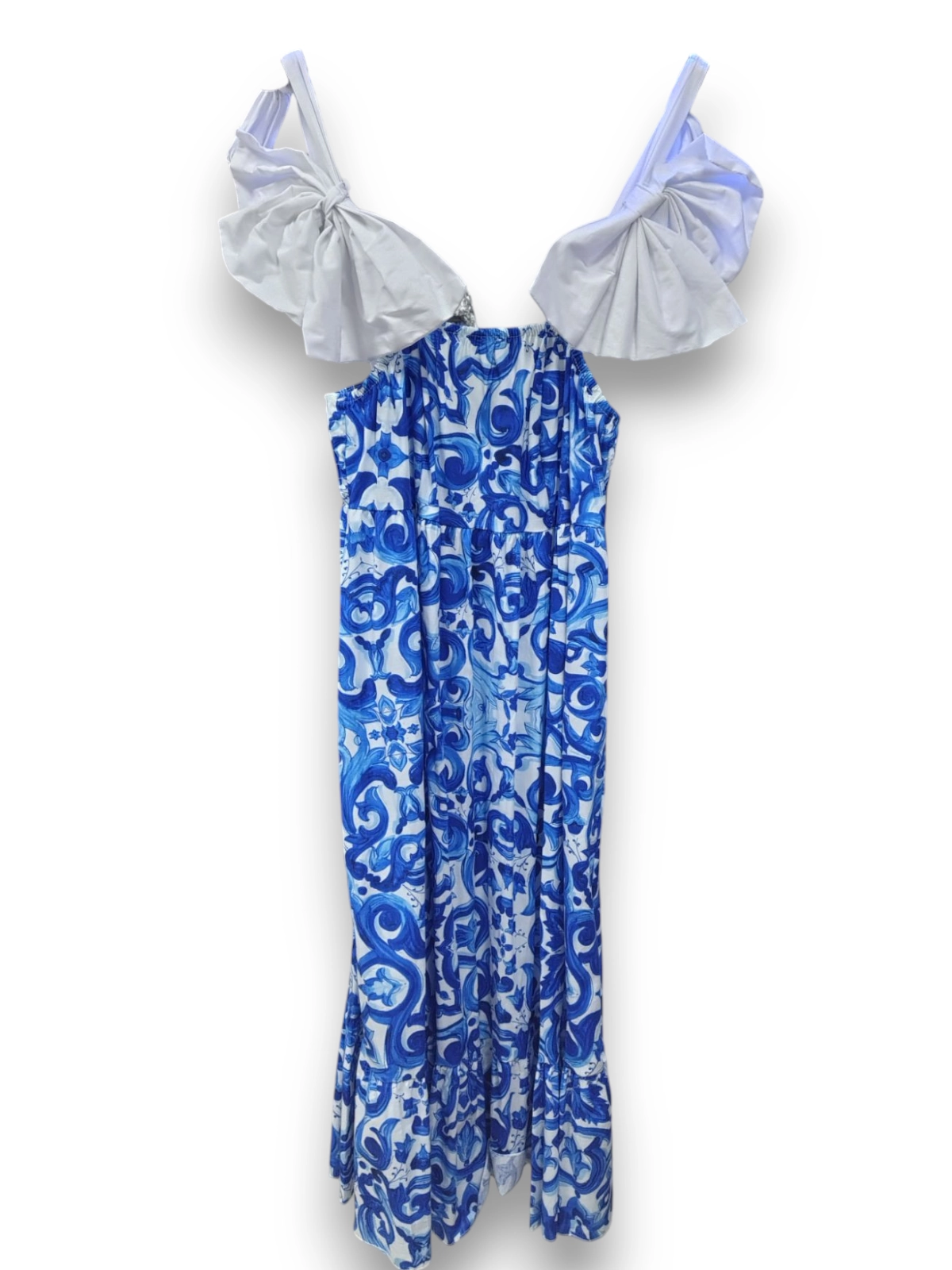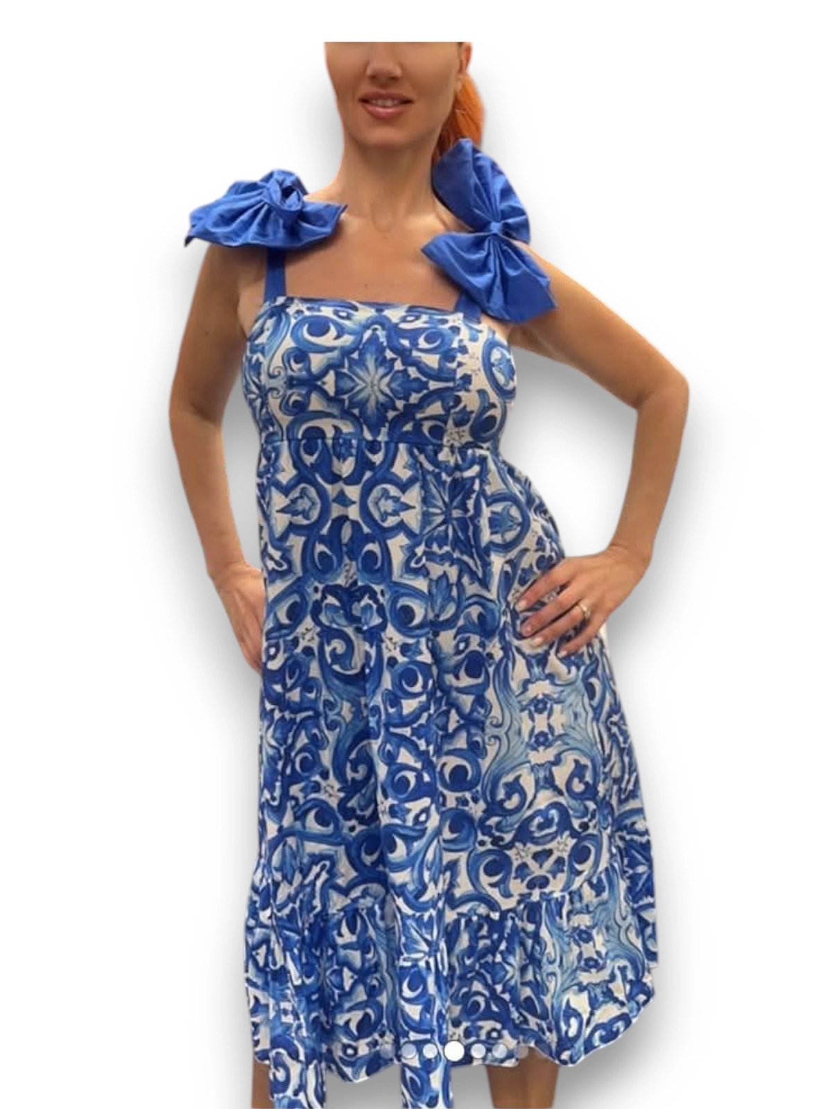 Rochia de vara cu bretele late decorative tip funde este alegerea perfecta pentru un look fresh si feminin in sezonul cald. Realizata dintr-un material lejer si placut la purtare, cu imprimeu inspirat din ceramica traditionala in nuante intense de albastru, aceasta rochie midi se potriveste perfect unei tinute casual-chic, de vacanta sau city break.