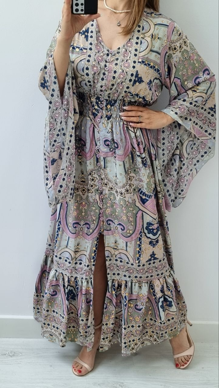 Descopera eleganta boho intr-o interpretare rafinata cu aceasta rochie lunga din matase indiana 80% si vascoza 20%, perfecta pentru zilele calduroase de vara sau serile relaxate la mare. Croiala lejera, talia marcata elastic si volanele fluide ofera un aer romantic si confort de neegalat. Manecile largi tip fluture si decolteul in V cu nasturi decorativi adauga un plus de feminitate si rafinament.