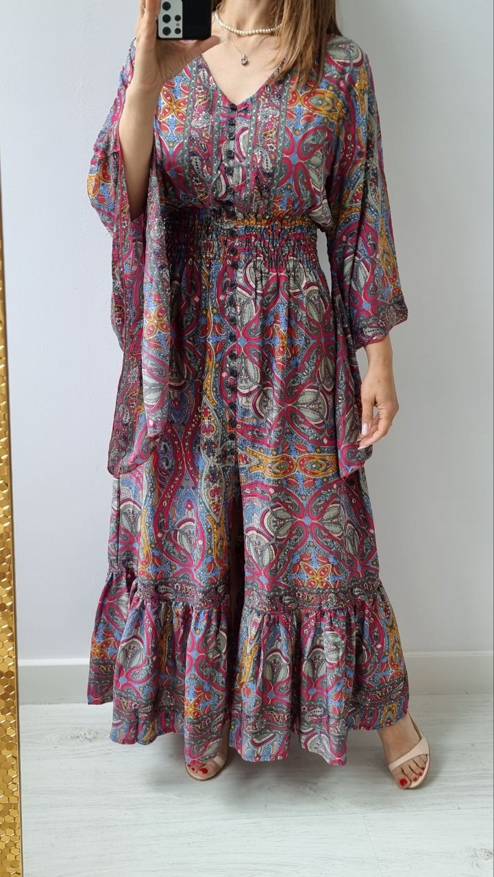 Descopera eleganta boho intr-o interpretare rafinata cu aceasta rochie lunga din matase indiana 80% si vascoza 20%, perfecta pentru zilele calduroase de vara sau serile relaxate la mare. Croiala lejera, talia marcata elastic si volanele fluide ofera un aer romantic si confort de neegalat. Manecile largi tip fluture si decolteul in V cu nasturi decorativi adauga un plus de feminitate si rafinament.
