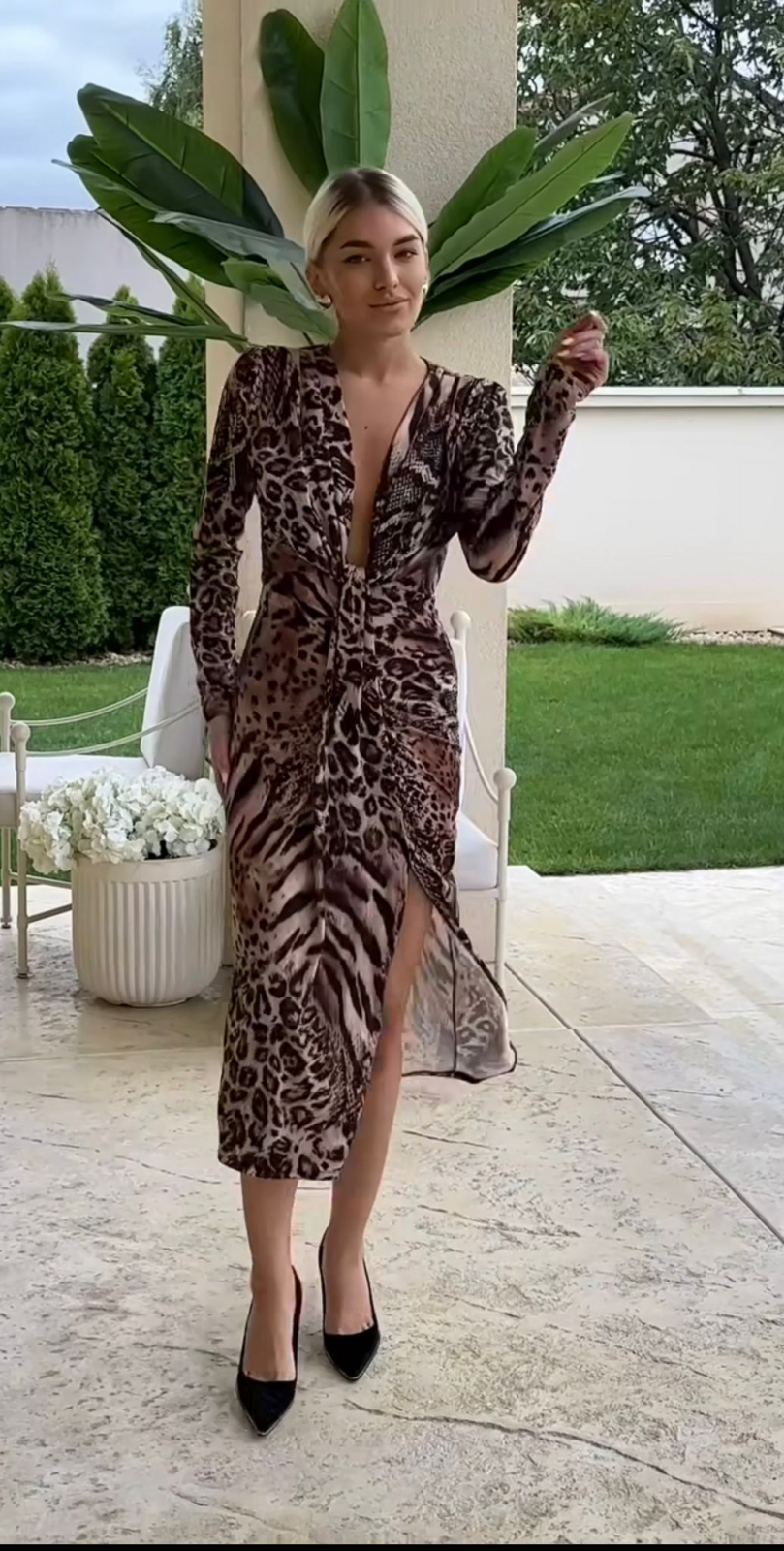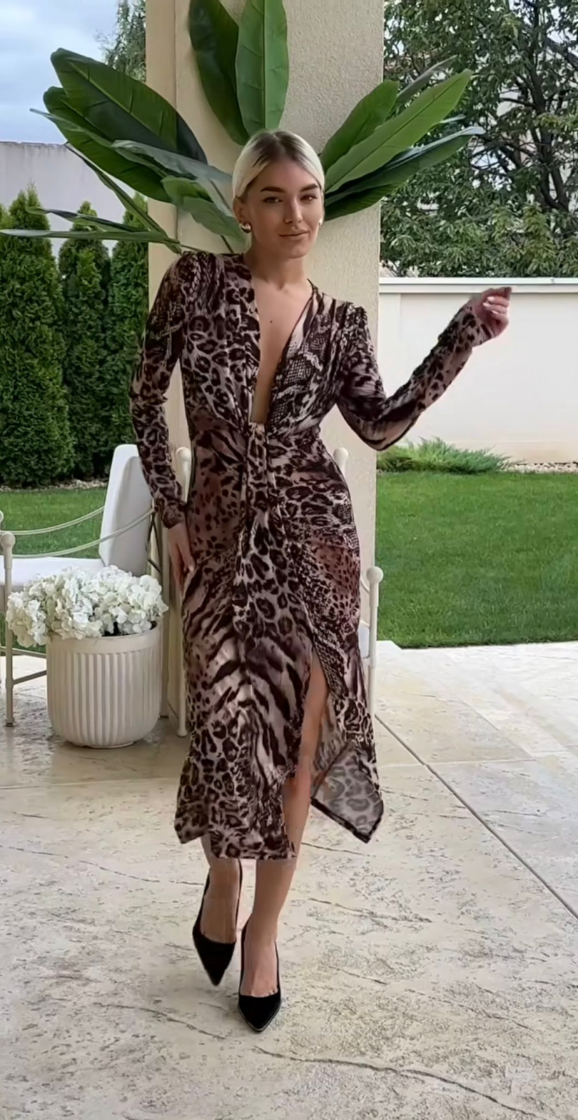 Rochie maxi cu imprimeu animal print si fronseuri - decolteu adanc - Hannah - maneca lunga