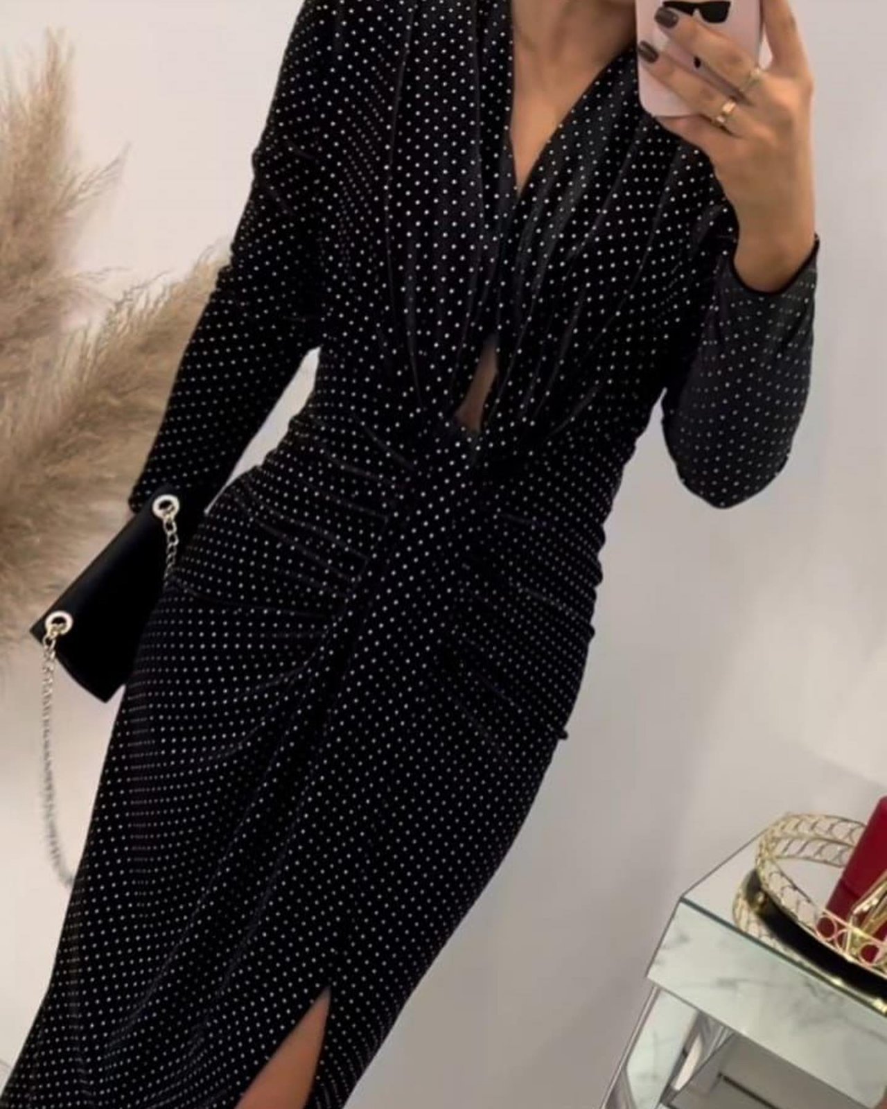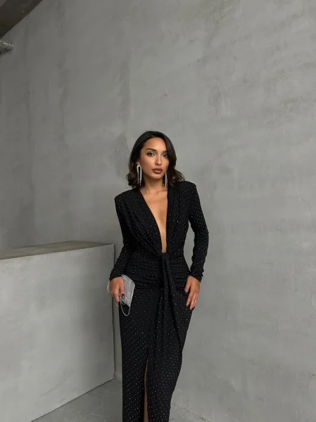 Rochie neagra maxi din jerseu cu strasuri cu fronseuri si decolteu adanc - Hannah - maneca lunga