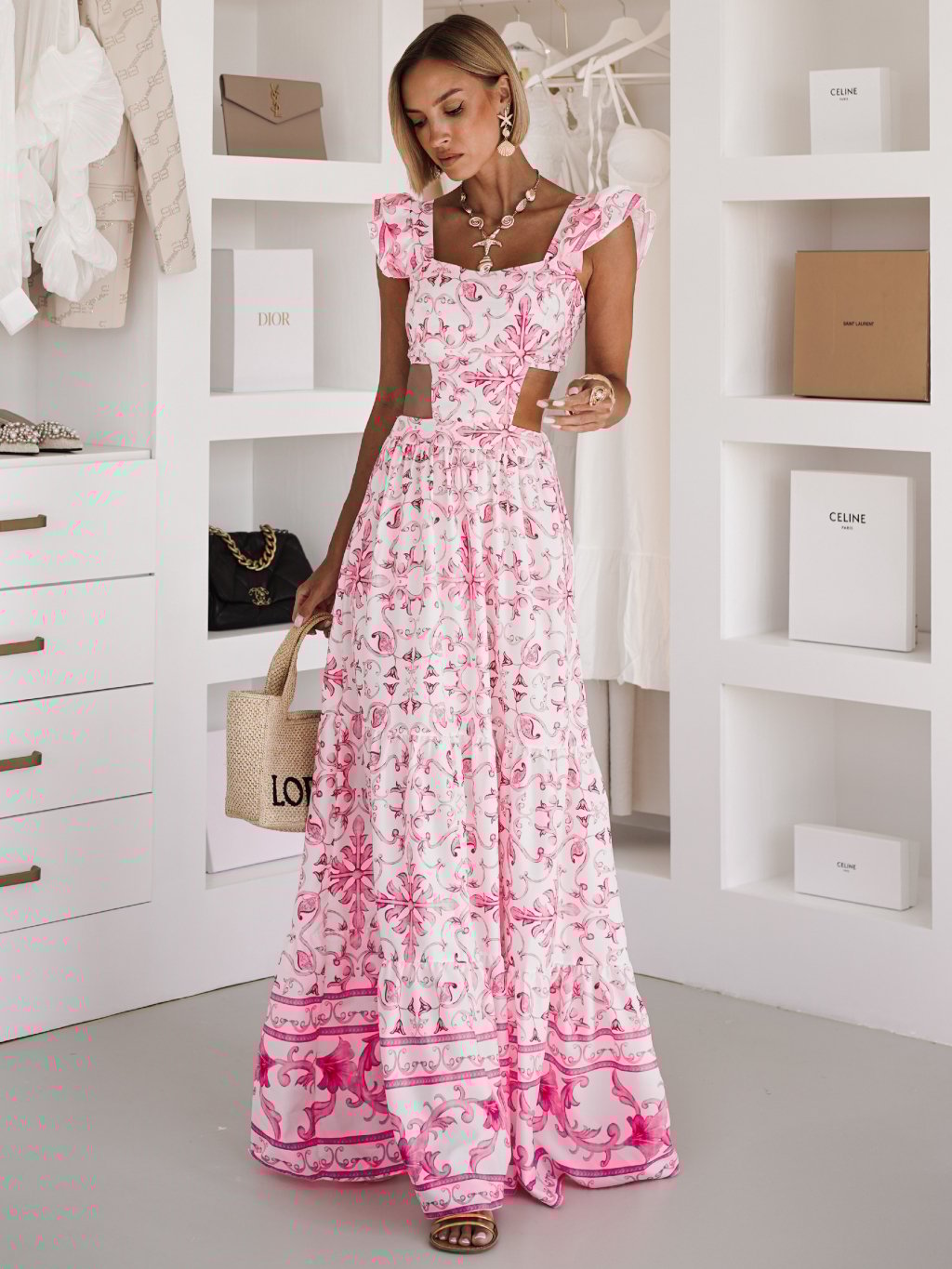 Rochie lunga imprimata cu decupaje laterale, volane si bust cu cupe. Marime universala S-M, disponibila pe roz si albastru.