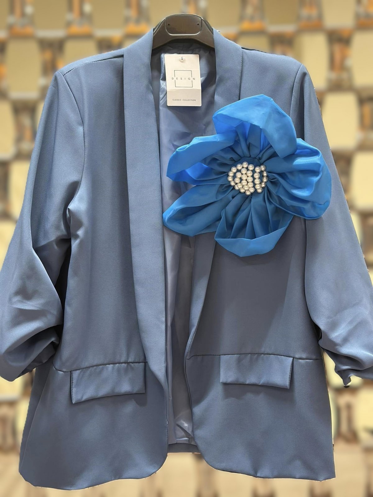 Sacoul este confecționat din materiale de înaltă calitate, asigurând o purtare plăcută și durabilitate. Floarea decorativă, împodobită cu perle delicate, adaugă un accent feminin și sofisticat, transformând orice outfit într-o declarație de stil.
