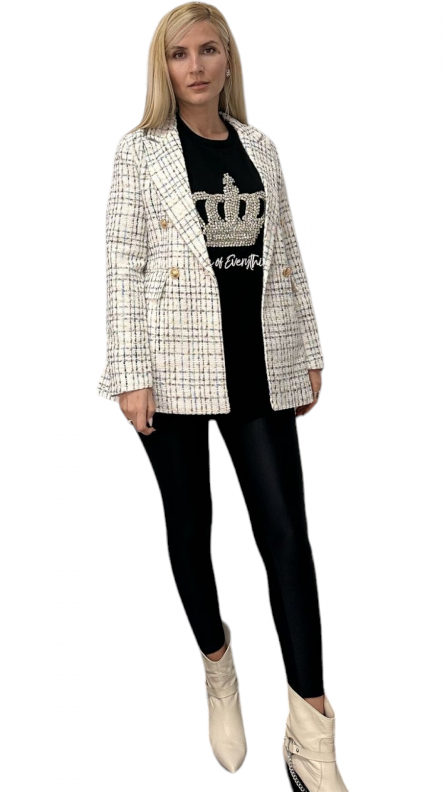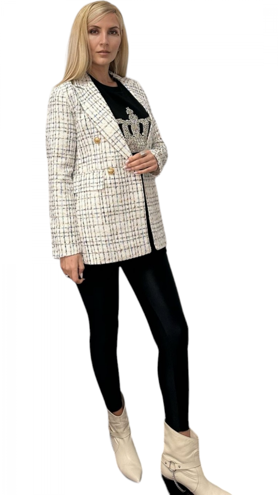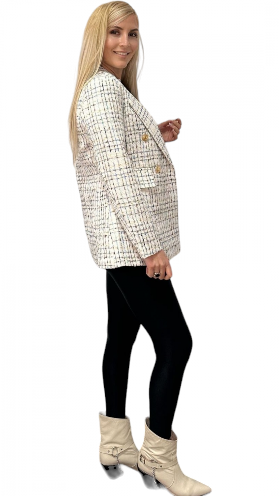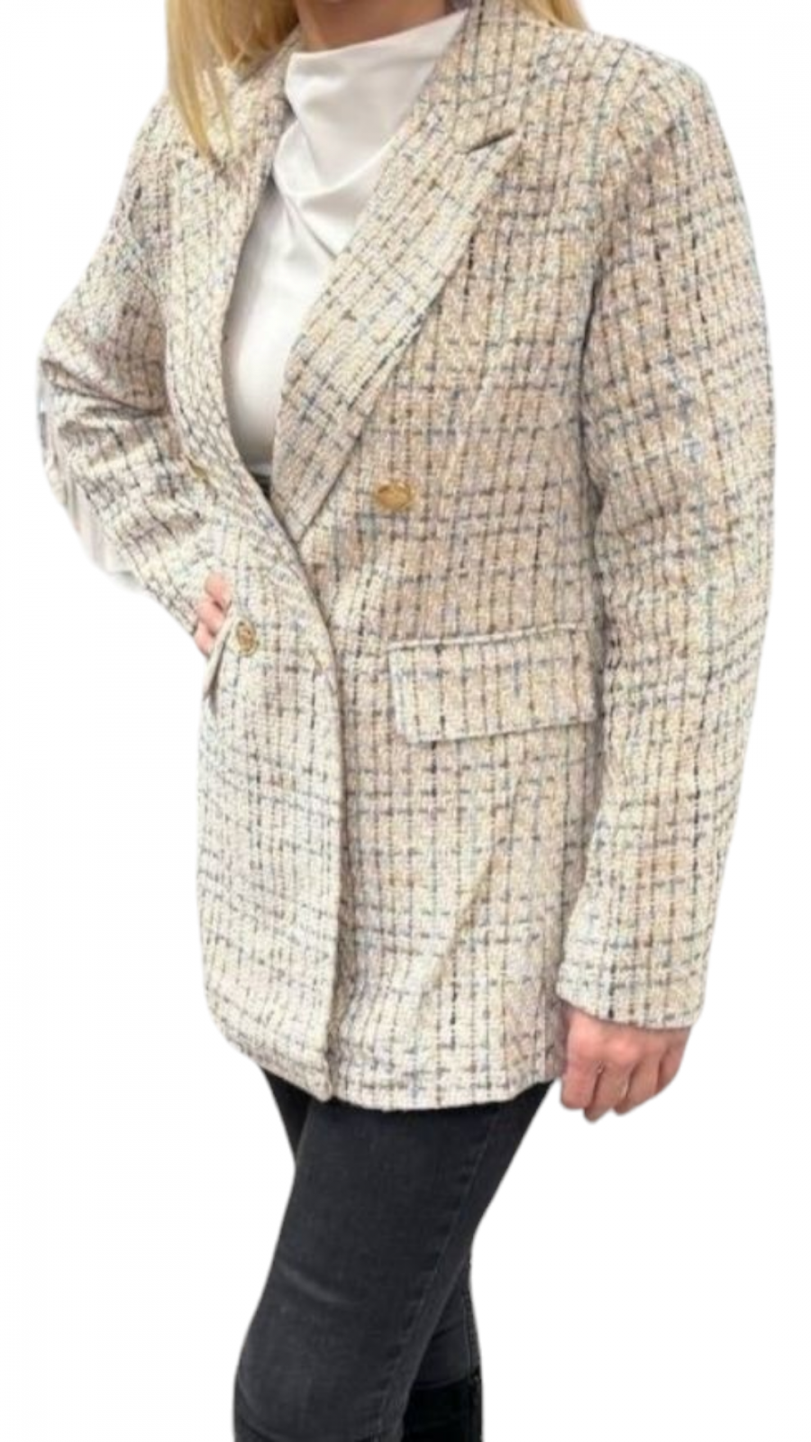 Elegant și practic, sacoul nostru lung cu rever in fata este realizat din bumbac cu adaos de elastan pentru confort sporit. Designul său modern include buzunare laterale si două randuri de nasturi, adăugând funcționalitate și stil. Potrivit pentru diverse ocazii, acest sacou se remarcă prin versatilitate și calitate. Perfecționat pentru a aduce un plus de rafinament oricărei ținute. Poate fi asortat cu o pereche de blugi sau la colanți.