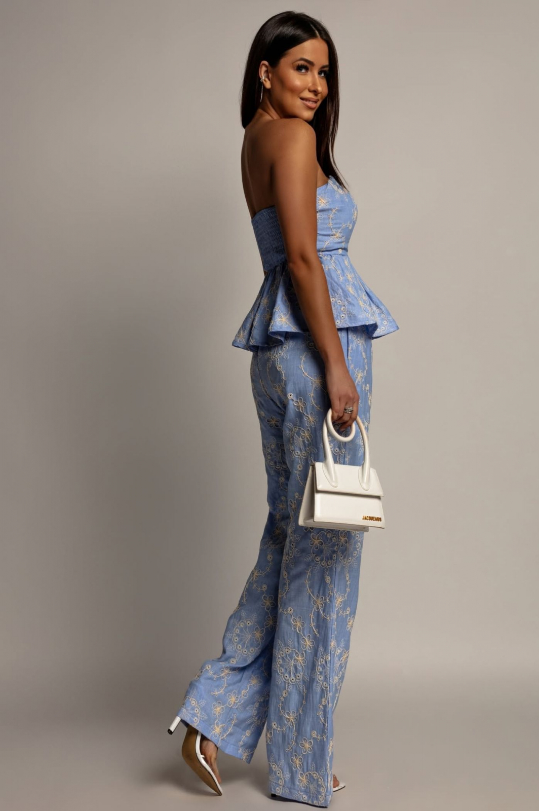 Redefinește-ți stilul estival cu această salopetă damă strapless, cu broderie florală romantică și un design ultra feminin. Bustiera tip corset este prevăzută cu peplum subtil în talie și elastic tip „fagure” la spate pentru o potrivire impecabilă și confortabilă. Pantalonii palazzo cu croi drept, lung și lejer oferă libertate de mișcare și alungesc optic silueta.