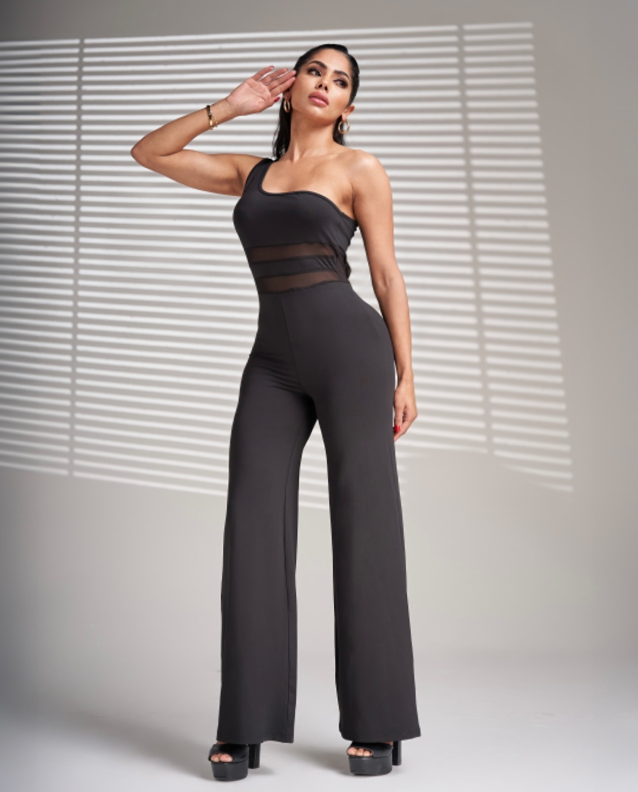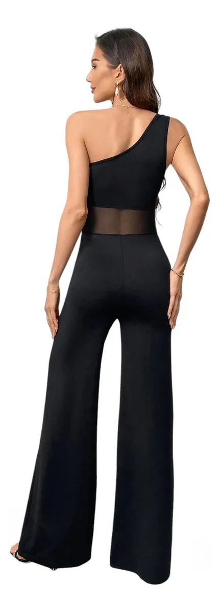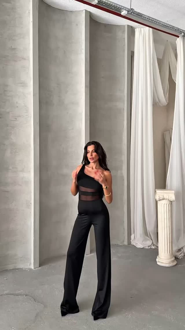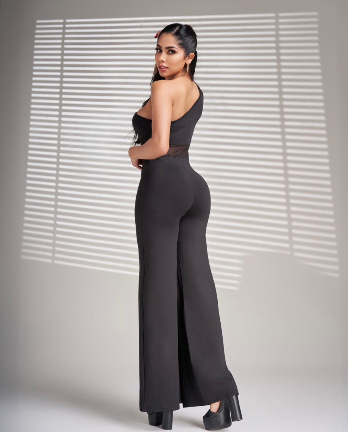 Redefineste eleganta moderna cu aceasta salopeta neagra spectaculoasa, realizata din material lycra elastic, ce contureaza armonios silueta. Modelul asimetric cu un umar gol si insertiile subtile de plasa transparenta in zona taliei adauga un aer sofisticat si senzual, ideal pentru evenimente de seara, cocktailuri sau ocazii speciale.