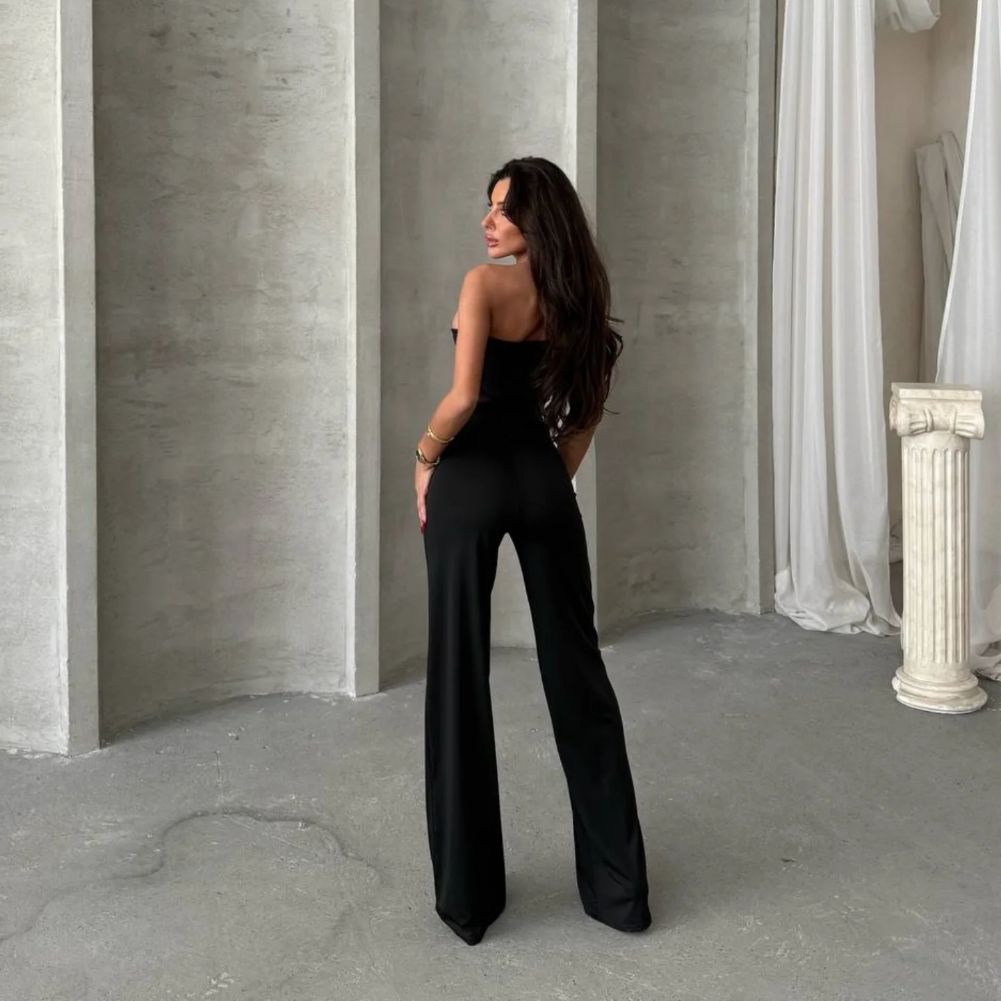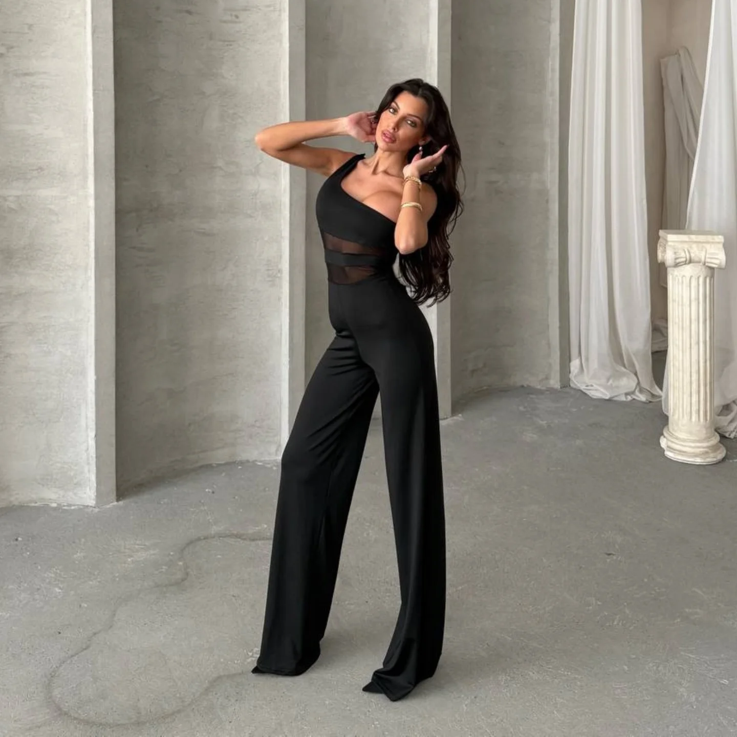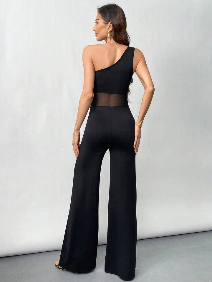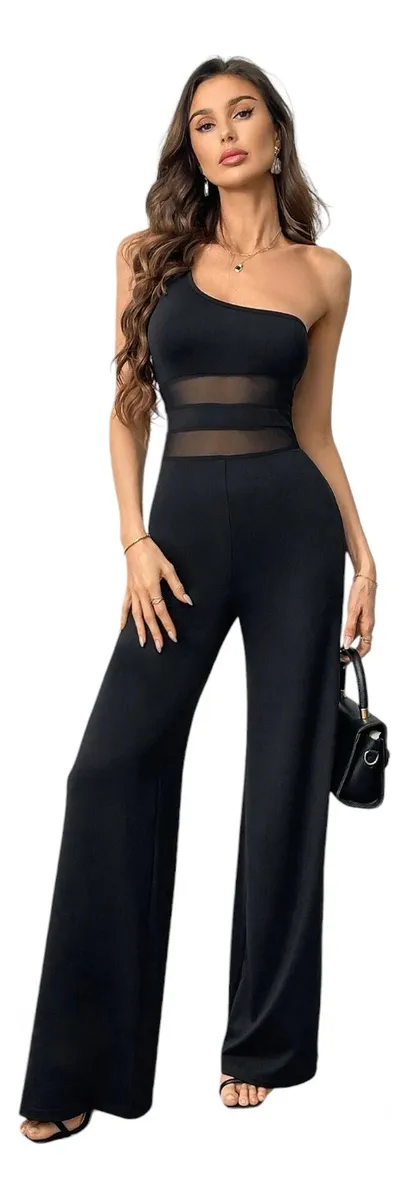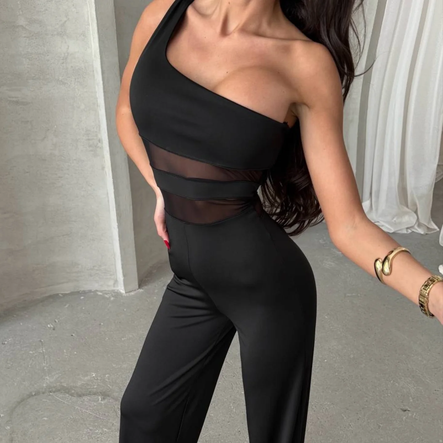 Redefineste eleganta moderna cu aceasta salopeta neagra spectaculoasa, realizata din material lycra elastic, ce contureaza armonios silueta. Modelul asimetric cu un umar gol si insertiile subtile de plasa transparenta in zona taliei adauga un aer sofisticat si senzual, ideal pentru evenimente de seara, cocktailuri sau ocazii speciale.